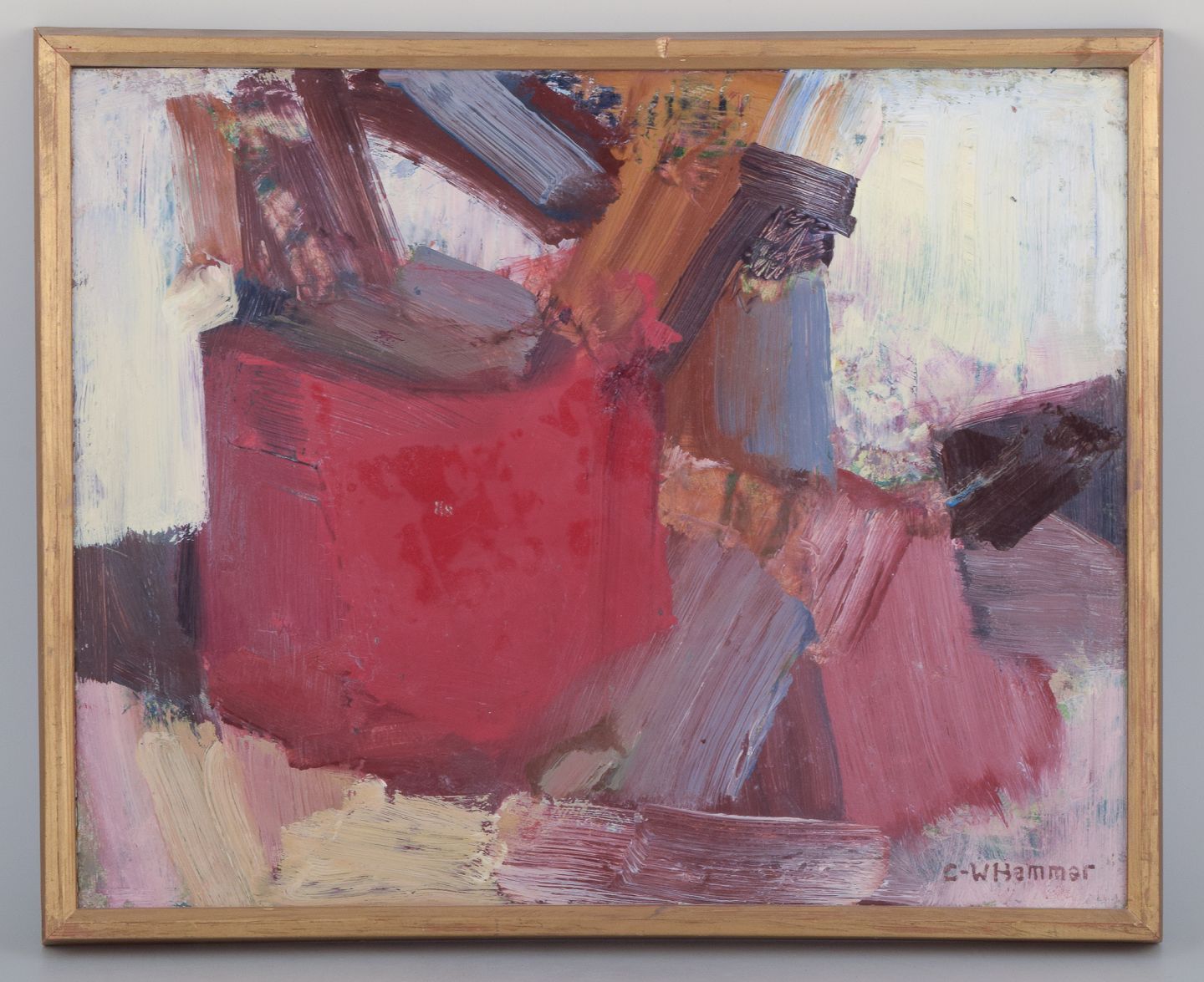 Carl-William Hammar (1918-2006), svensk kunstner, olie på plade. Abstrakt komposition. Dateret 1966 på bagside. Signeret. I flot stand. Ramme med mindre slag. Se foto. Lysmål: 40,0 cm x 32,0 Total 43 x 35,0