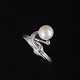 Elegant ring i organisk form med en centralt placeret hvid perle og to brillantslebne diamanter, indfattet i 18 karat hvidguld. Stemplet 750.