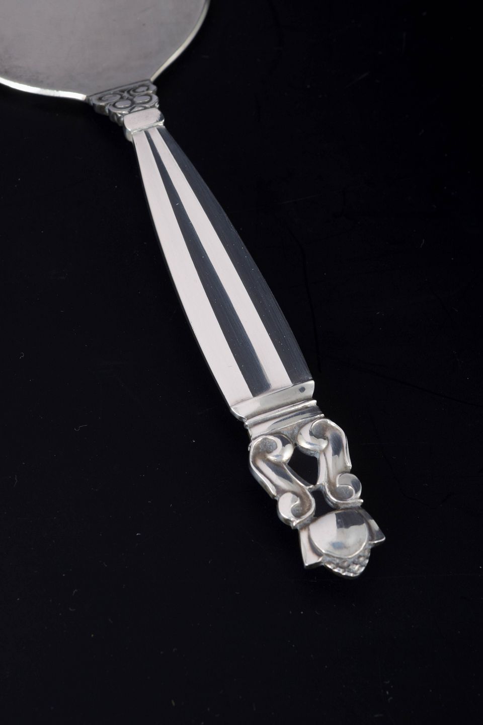 Elegant sandwichspade i det klassiske “Konge / Acorn”-mønster, designet af Johan Rohde i 1915. Skaftet er udsmykket med det karakteristiske akantusblad og agernmotiv.