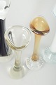 Serie af fire mundblæste glasvaser i klare og opaline nuancer af hvid, rav, røgfarvet og sort. Elegant organisk form med bred, blød kant og afrundet fod. Én vase signeret i bunden “Flygsfors 55”.