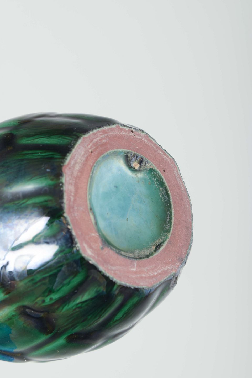 Lille dråbeformet vase i stentøj med blank grøn og blå glasur i lodret reliefmønster.
