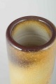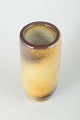 Cylindrisk vase i stentøj med flydende glasur i gule og brunlige nuancer, med blød overgang mellem matte og blanke partier.