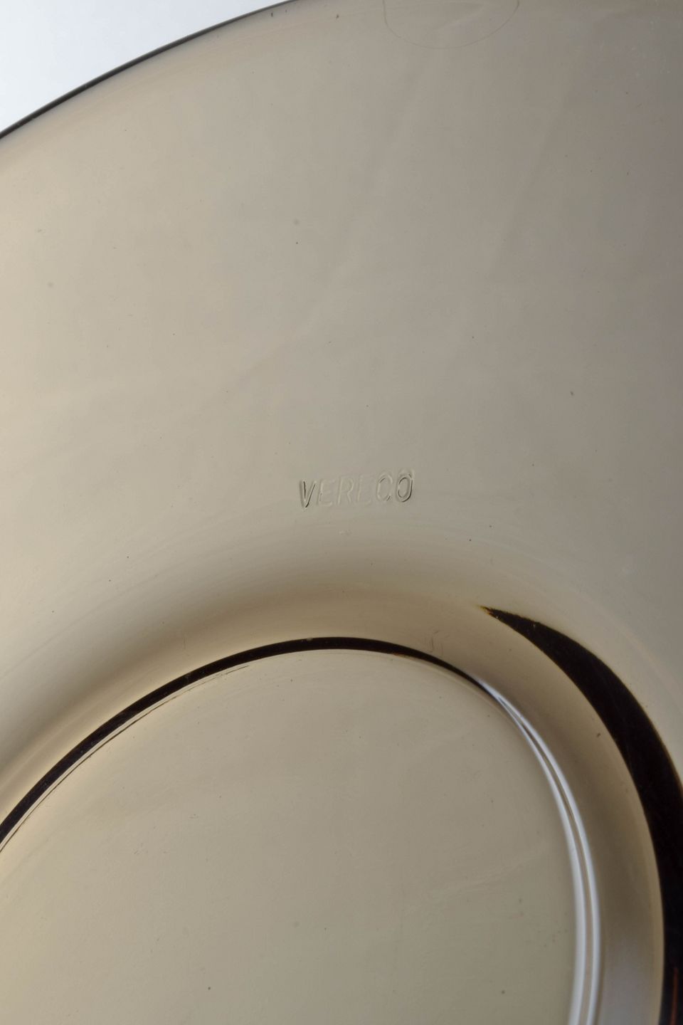 Sæt bestående af fire kopper og fire underkopper i røgfarvet glas. Klassisk fransk design fra Vereco, kendt for sit funktionelle og tidstypiske glas med enkle linjer og varme nuancer.
