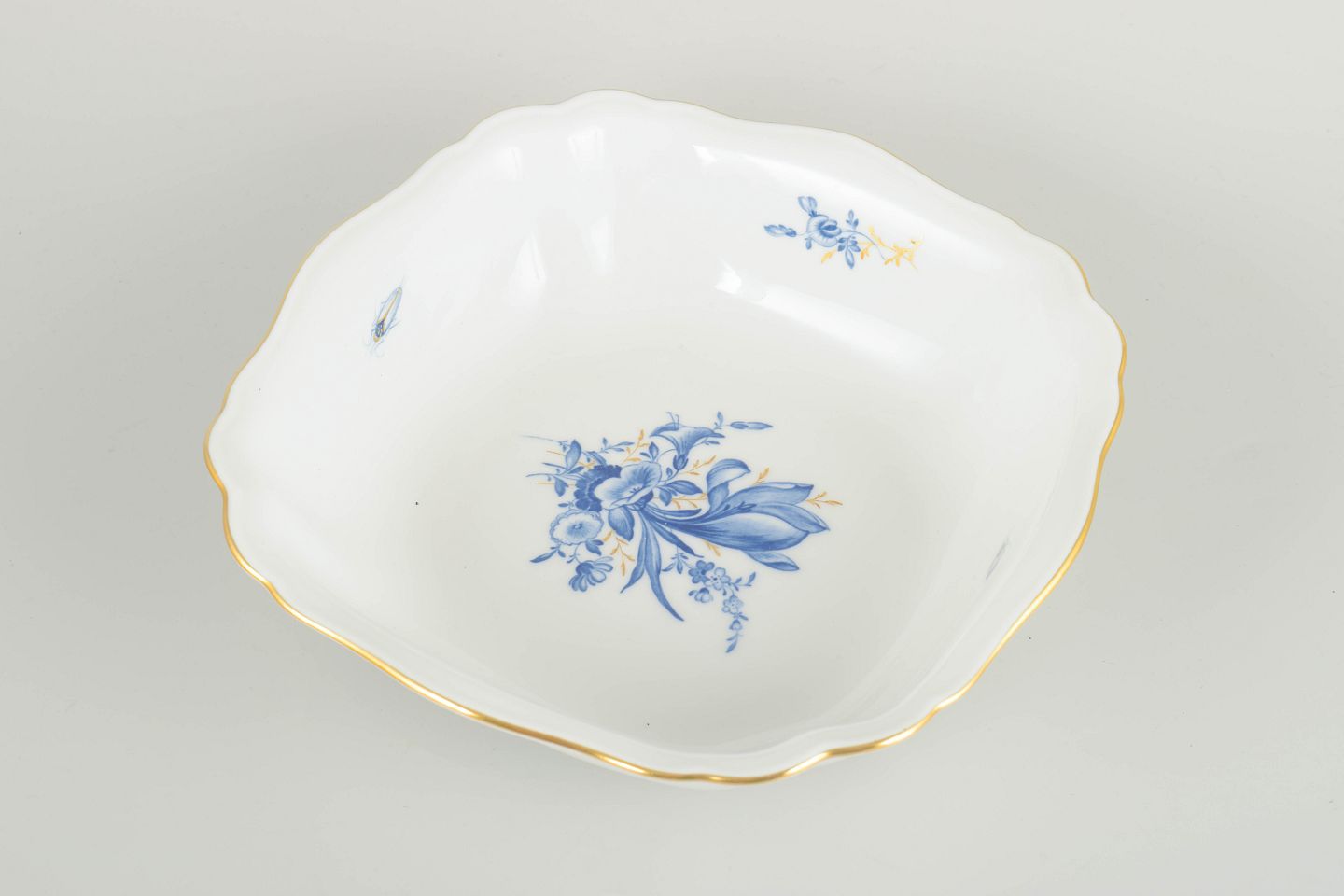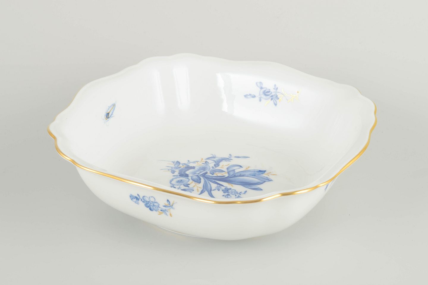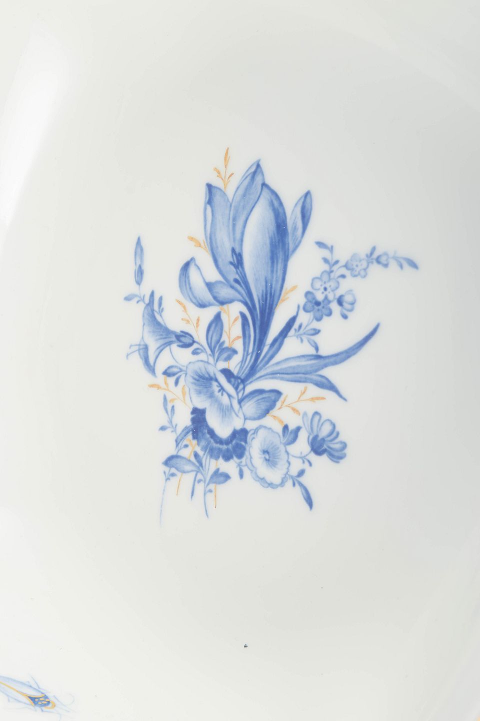Hånddekoreret porcelæn med håndmalede blå blomster i klassisk Meissen-stil og forgyldt staffering langs den bølgende kant. Elegant barokinspireret form.