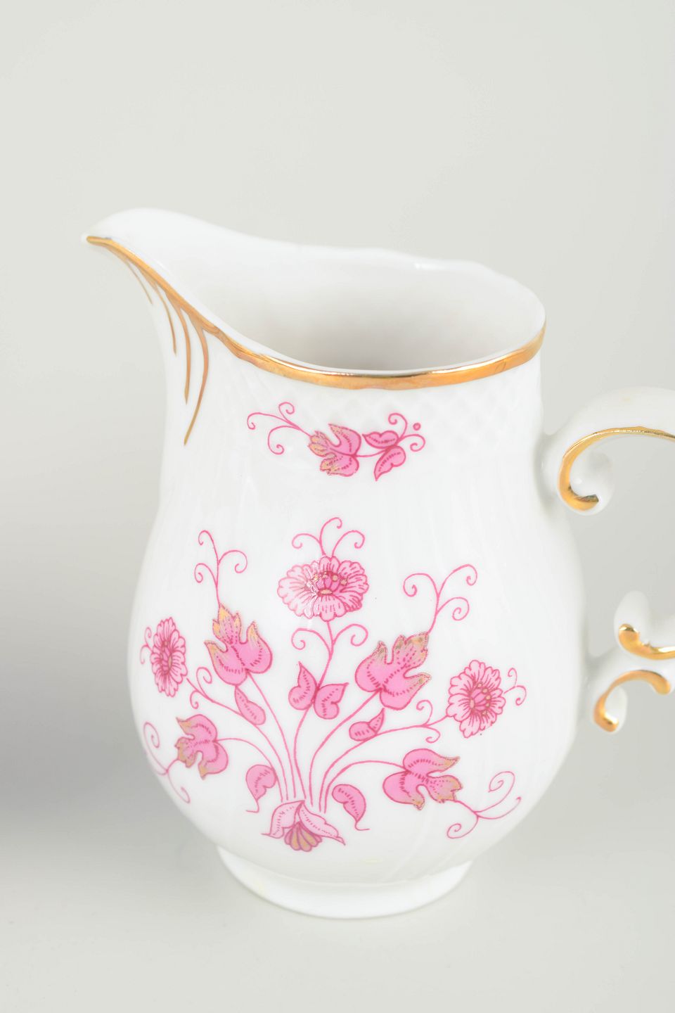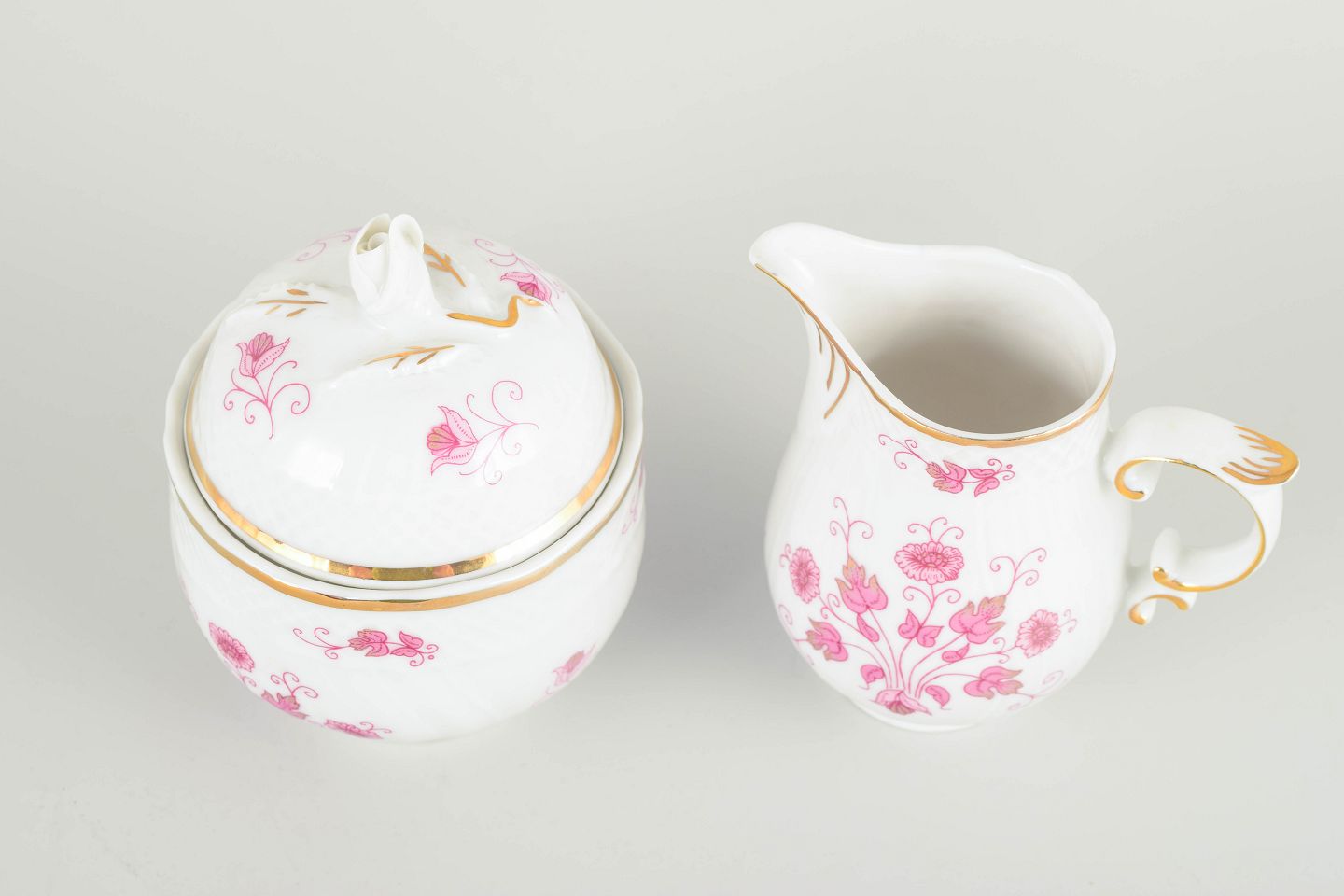 Hand-decorated porcelain with pink floral motifs and gilt accents along rims and handles. Classic curvilinear form with refined elegant expression.