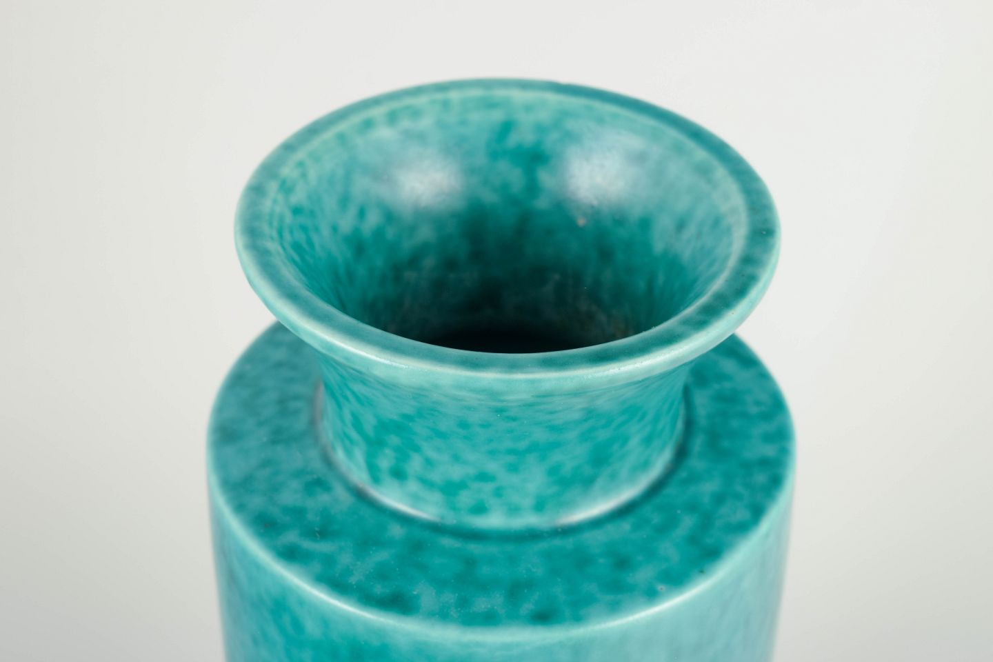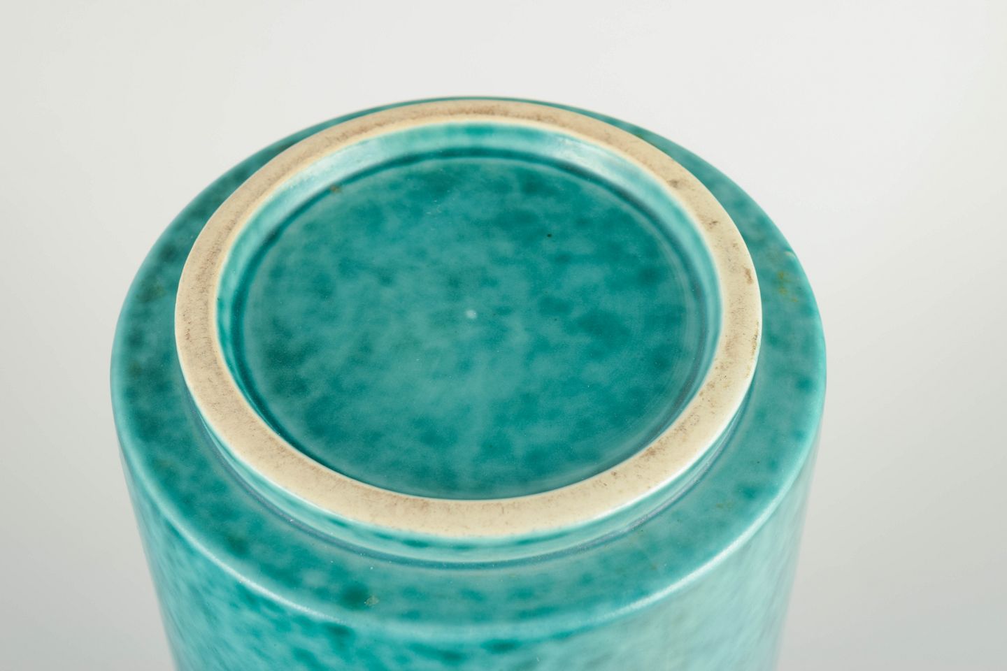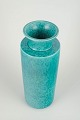 Ustemplet vase i høj cylindrisk form med svungen, udadbøjet hals og dyb turkis glasur med levende farvespil – typisk for Kåges Azur/Tonan-serie. Elegant og skulpturel art deco-karakter.