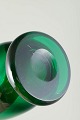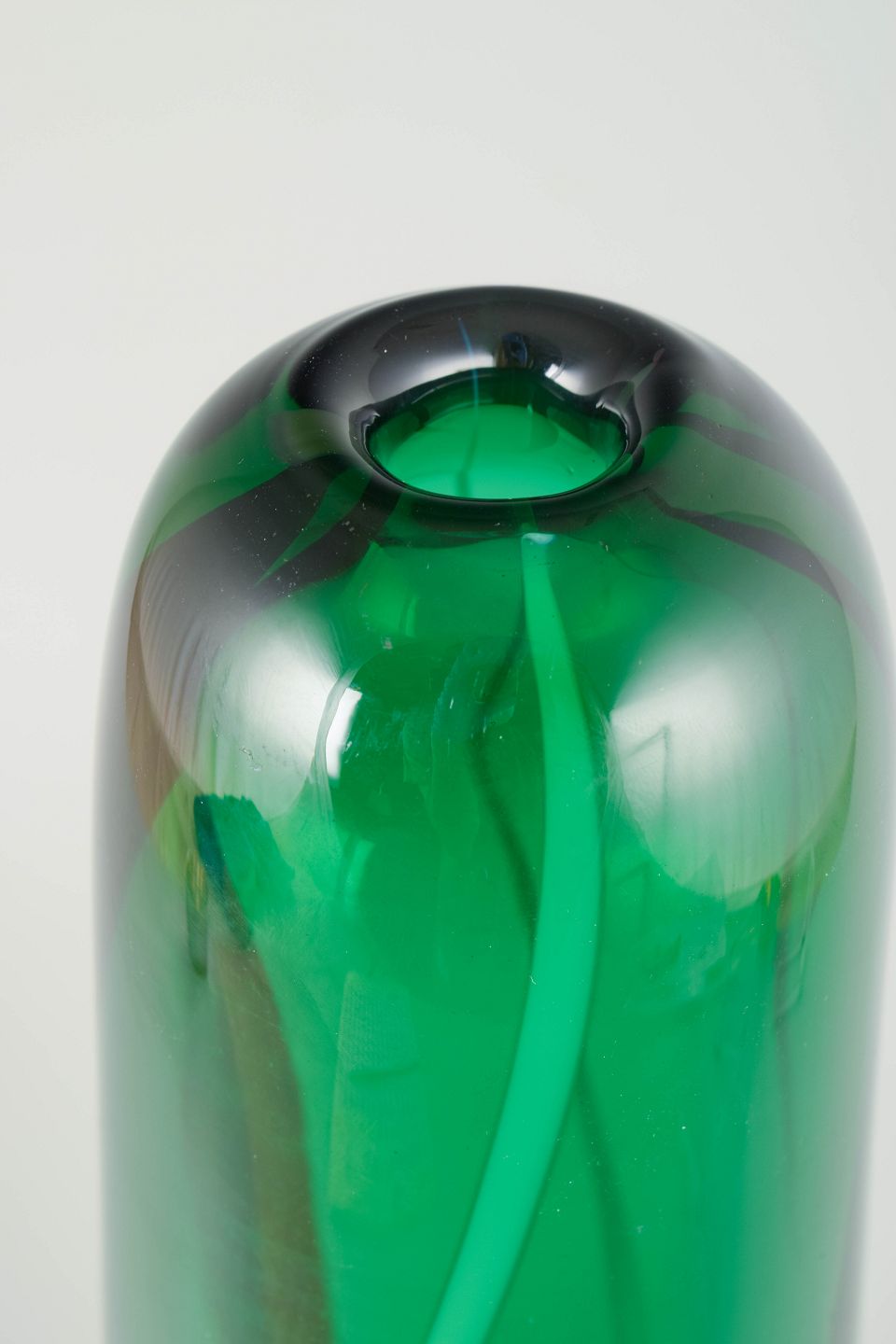 Mundblæst skandinavisk studioglas med tonegradueret farveskift fra blå til grøn. Stor skulpturel dobbelt­balusterform med slank hals.