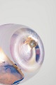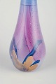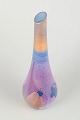 Elegant slank art-glass vase i mundblæst glas med iriserende overflade i pastelrosa, blå og gyldne toner samt indfangede organiske farveelementer.
