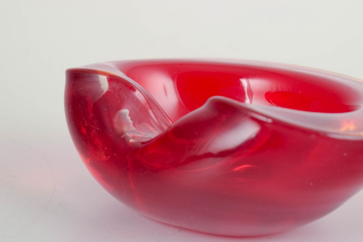 Organisk fritformet mundblæst skål i intens rubinrød sommerso-glas med blødt indfoldet rand og svævende klarhedsdybde — et klassisk eksempel på studioglas fra Murano.