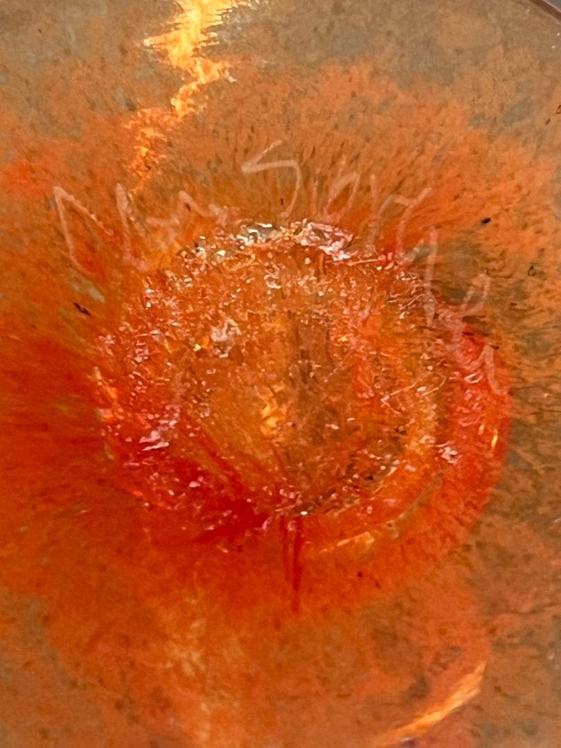Håndlavede snapseglas i mundblæst glas med levende farvespil i orange, rosa, gule og blå nuancer. Hvert glas er unikt med lette variationer i form og dekoration, karakteristisk for eksperimenterende svensk kunstglas fra perioden.