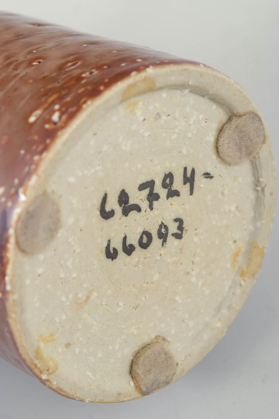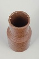 Cylindrisk studiovase i hånddrejet stentøj med brunligt, let nuanceret glasurspil og subtil overfladestruktur. Den enkle, funktionelle form fremhæver materialets naturlige karakter og det tydelige håndværk.