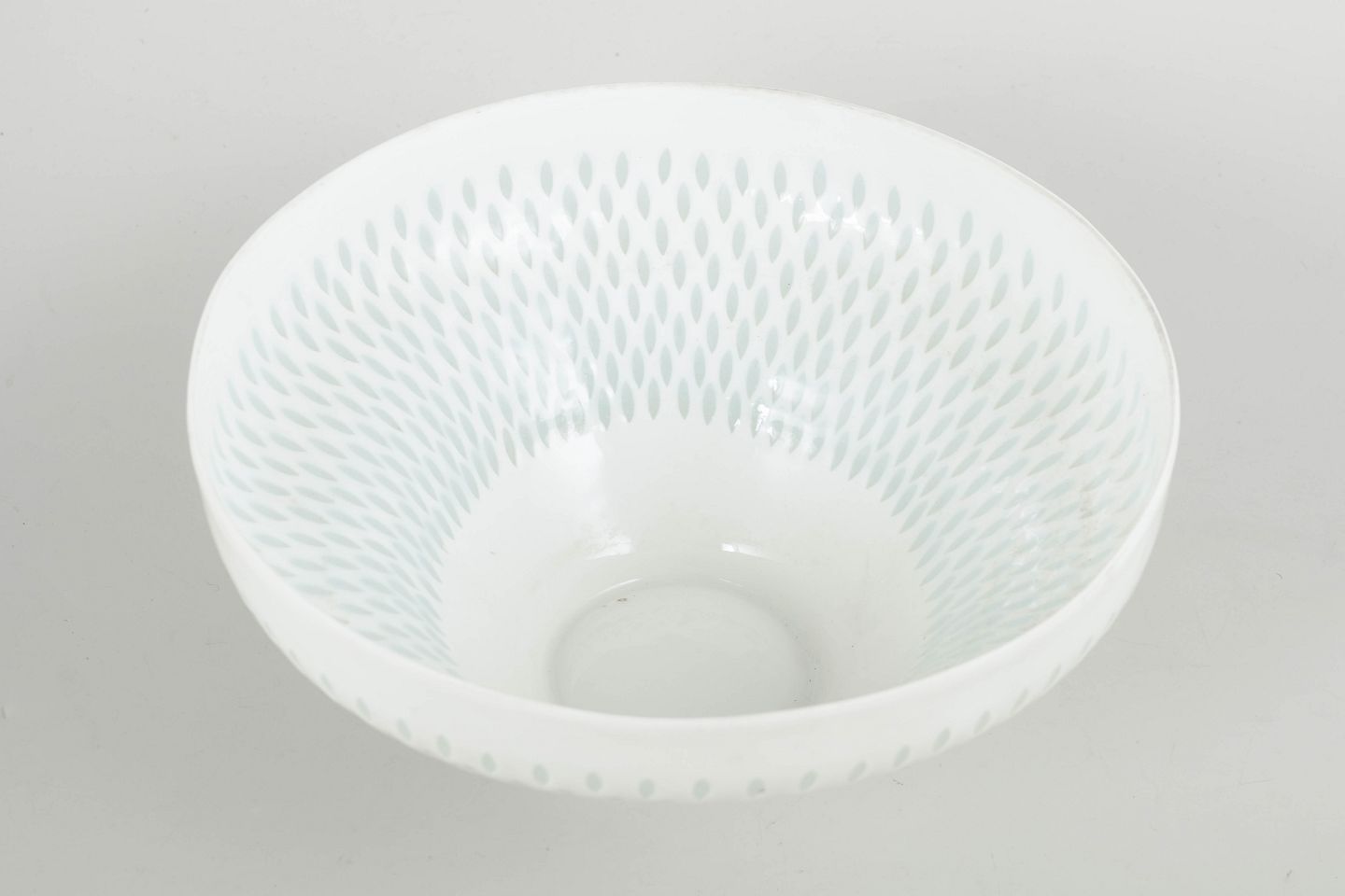 Stor, elegant skål i hvidt porcelæn med gennembrudt “rice porcelain”-struktur, hvor det fine, perforerede mønster skaber et let og transparent udtryk. Den balancerede, koniske form og den subtile dekoration er karakteristisk for Friedl Holzer-Kjellbergs modernistiske designs for Arabia.