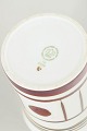 Cylinderformet vase i fajance med hvid glasur og grafisk dekoration i brunlige og violette toner. Dekoren består af bånd, linjer og cirkulære felter, typisk for serien Trude, der afspejler 1970’ernes enkle, modernistiske formsprog.