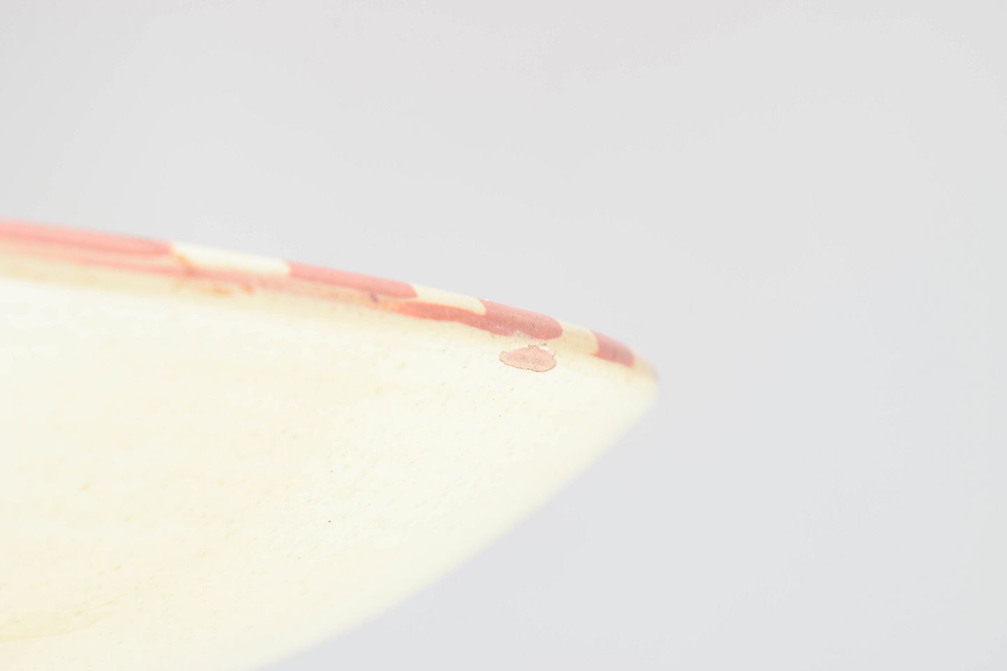 Dekorativ skål i fajance med karakteristisk slynget slipdekoration i rosa, creme og mørke kontrasttoner. Den brede, lavtbuede form fremhæver den dynamiske, spiralformede dekoration, som er typisk for Kählers kunstneriske produktion i mellemkrigstiden. Et fint eksempel på dansk keramikkunst fra 1930’erne.