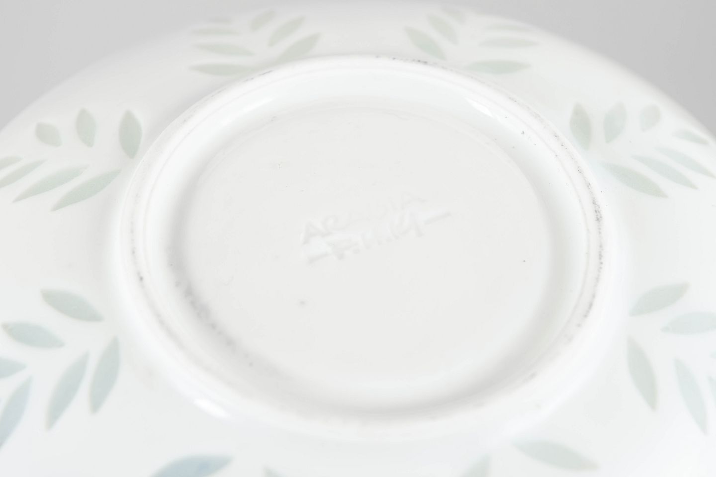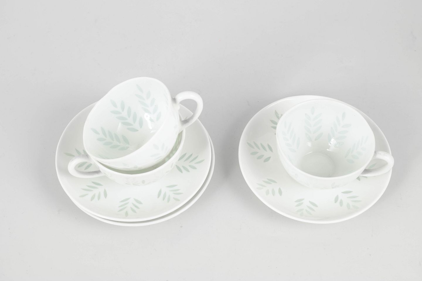 Elegant sæt bestående af tre mokkakopper med tilhørende underkopper i hvidt porcelæn, dekoreret med diskret bladornamentik udført i transparente, let grønligt tonede glasurfelter. Det lette og raffinerede udtryk kombineret med de bløde former er karakteristisk for Friedl Holzer-Kjellbergs sene porcelænsproduktion for Arabia.