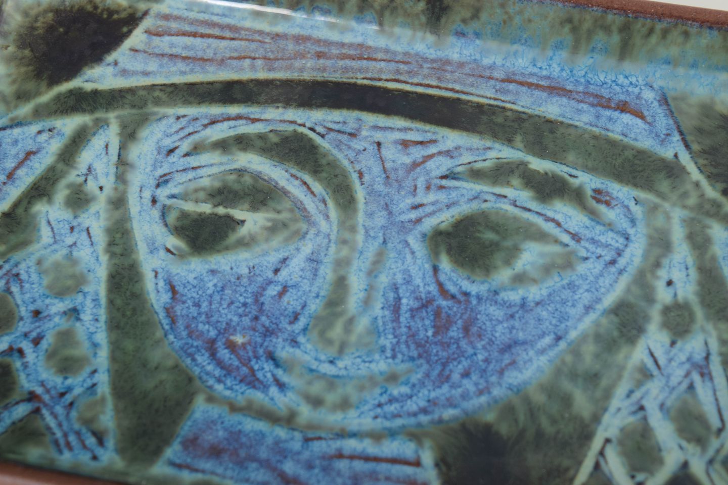 Rektangulært stentøjsfad med reliefdekoration forestillende stiliseret ansigt. Udført i brunligt stentøj med blå og grøn glasur i fordybningerne. Model 5906.