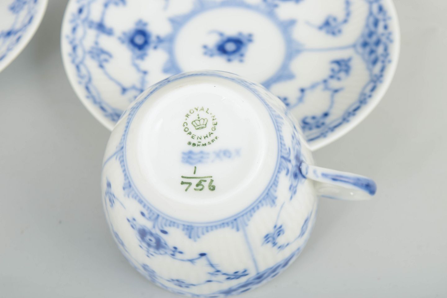 Sæt af to kaffekopper med tilhørende underkopper i håndmalet porcelæn fra Musselmalet Halvblonde med klassisk underglasurdekoration i koboltblå, riflede felter og karakteristisk blondekant. Model 1/756. Første sortering. Fremstillet 1966.