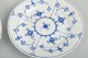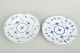Sæt af tre kagetallerkener i håndmalet porcelæn fra Musselmalet Riflet med klassisk underglasurdekoration i koboltblå. Model 1/181. Hver tallerken måler 16 cm i diameter. Annulleret med én indridset streg under bunden. Fremstillet 1950.