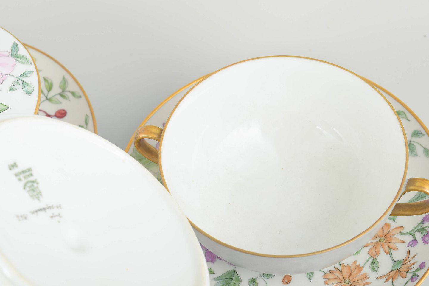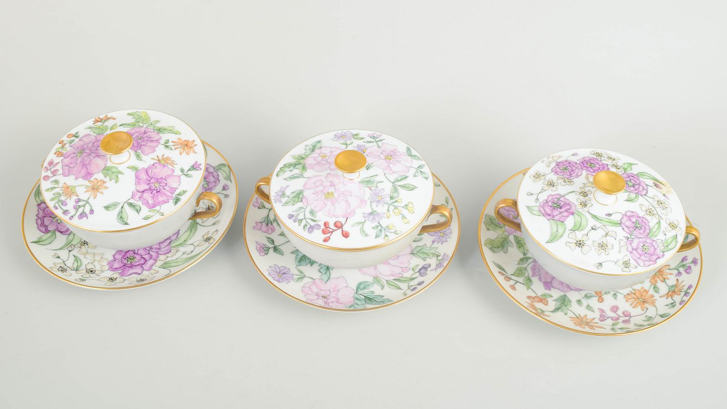 Håndmalede bouillonkopper med låg og dobbelte hanke i porcelæn med polykrom blomsterdekoration og guldkant.