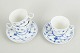 Sæt af tre mokkakopper med tilhørende underkopper i håndmalet porcelæn fra Musselmalet Riflet med klassisk underglasurdekoration i koboltblå.