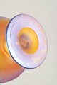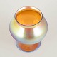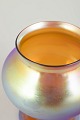 Kompakt vase i mundblæst glas med rundet, næsten kugleformet korpus og kort stilkfod. Overfladen fremstår med silkemat iriserende finish i gyldne, rosa og blålige nuancer med varm kobberfarvet glød indvendigt. Den harmoniske proportionering og det levende farvespil er karakteristisk for Loetz’ produktion i 1920’erne, hvor klassiske former blev kombineret med raffinerede metalliske effekter.