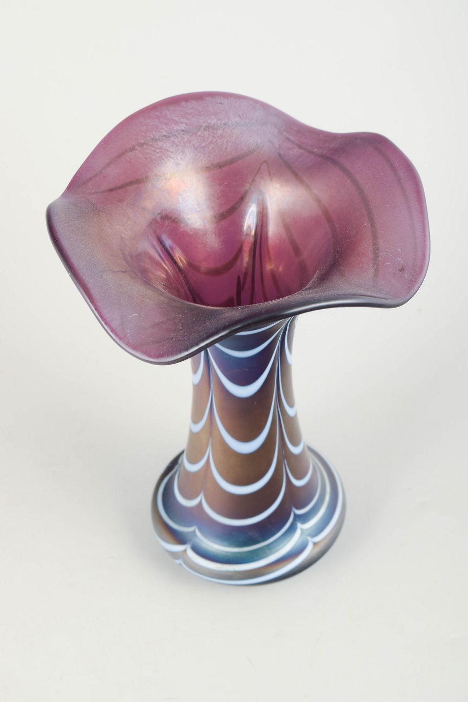 Johann Loetz Witwe was founded in 1836 by Johann Eisner in Klostermühle in southern Bohemia, now part of the Czech Republic. In 1851 the glassworks was acquired by Susanne Loetz, widow of Johann Loetz, together with her husband Frank Gerstner, and she significantly expanded the company. Under the direction of Maximilian von Spaun, the factory gained international recognition around 1900 for its iridescent glass, including the celebrated Phänomen series, which won Grand Prix awards in Paris in 1900 and St. Louis in 1904. After financial difficulties, fires and changes of ownership, production continued into the twentieth century before the glassworks finally closed in 1947.