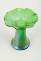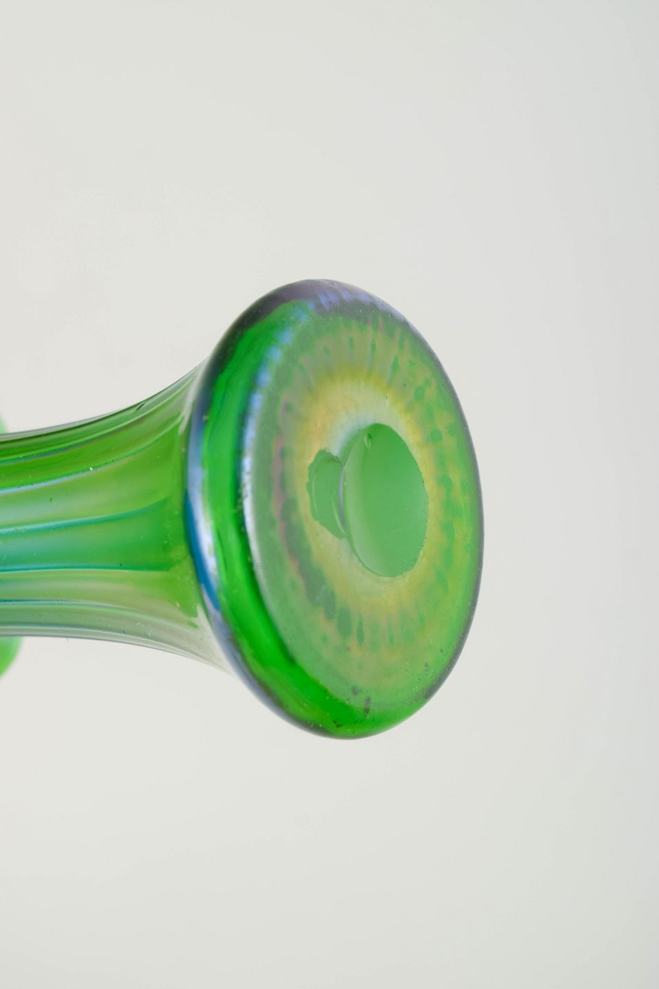Elegant vase in mouth-blown glass with a wavy flaring rim and a slender, curving body. The surface displays a strong iridescent effect in vivid green tones with bluish nuances at the base. The scalloped rim and vibrant colour play are characteristic of Loetz production in the 1920s, when decorative silhouettes and metallic sheen remained central to the glassworks’ aesthetic.