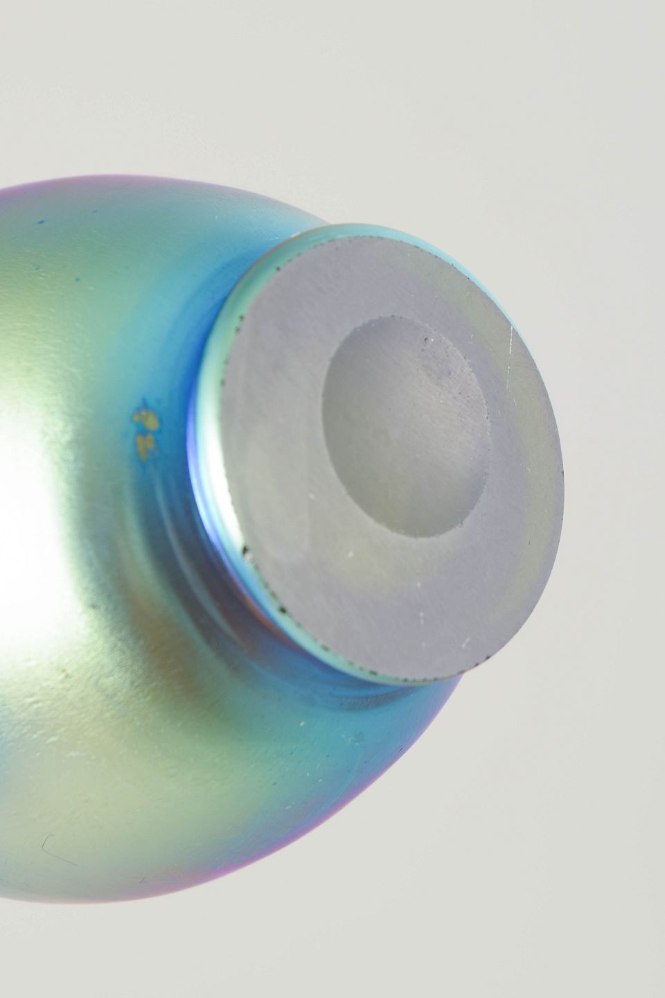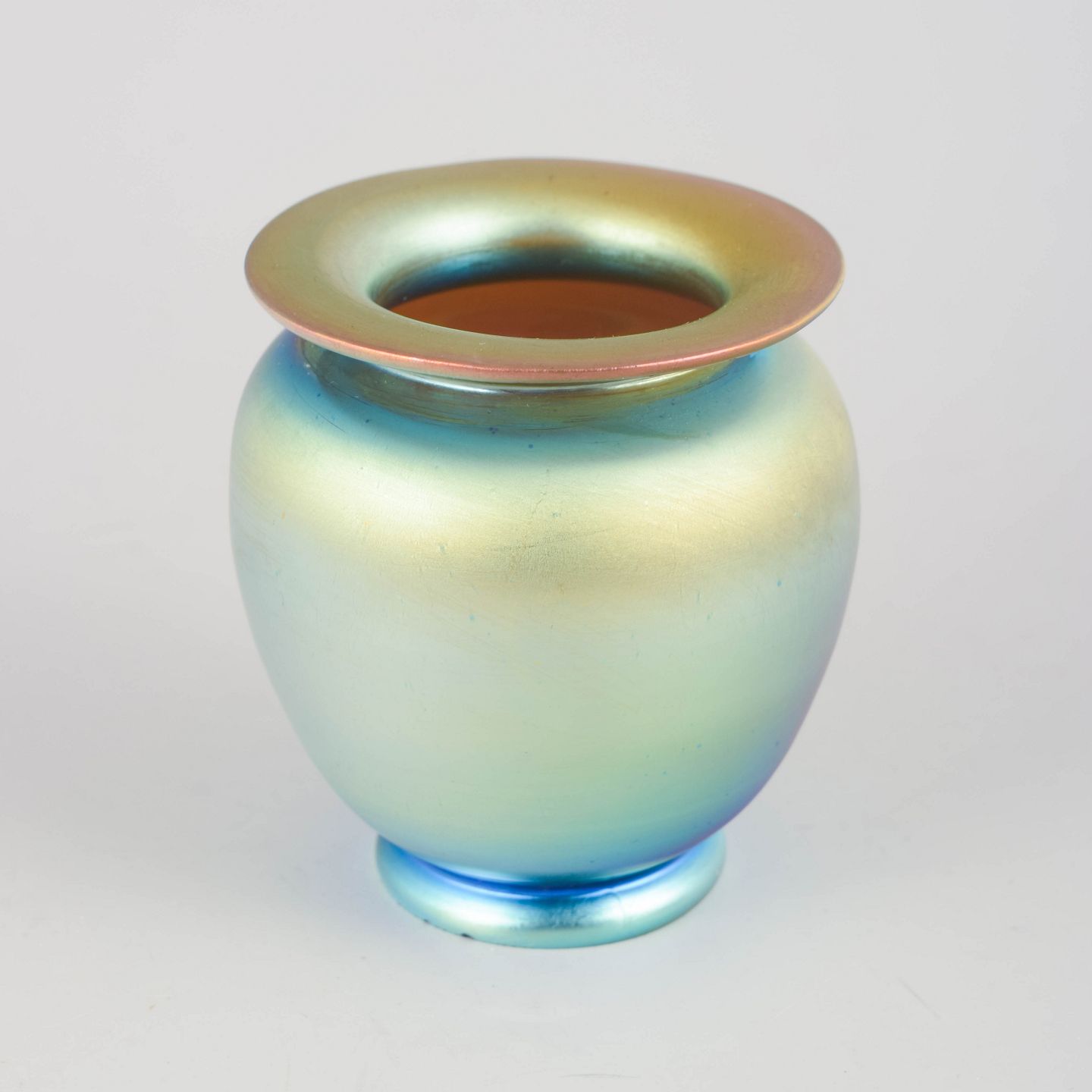 Elegant vase in mouth-blown glass with a silky matte iridescent surface in blue-green and golden tones with a coppery hue at the rim. The harmonious rounded body with a wide flaring collar and small foot ring is characteristic of Loetz production in the 1920s, where subtle colour transitions and metallic sheen were combined with simple, well-balanced forms.