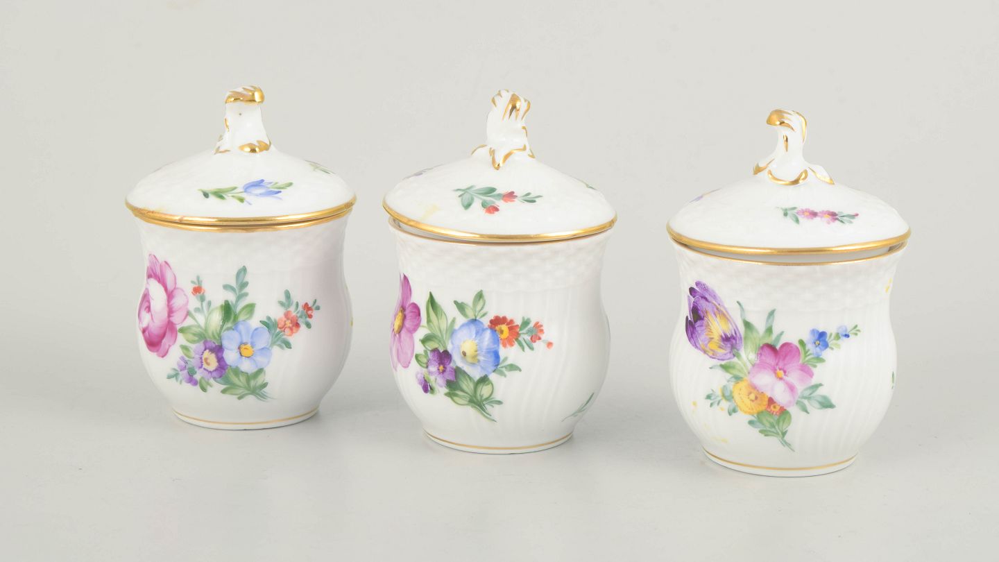 Royal Copenhagen, saksisk blomst sæt af tre cremekopper med tilhørende låg.