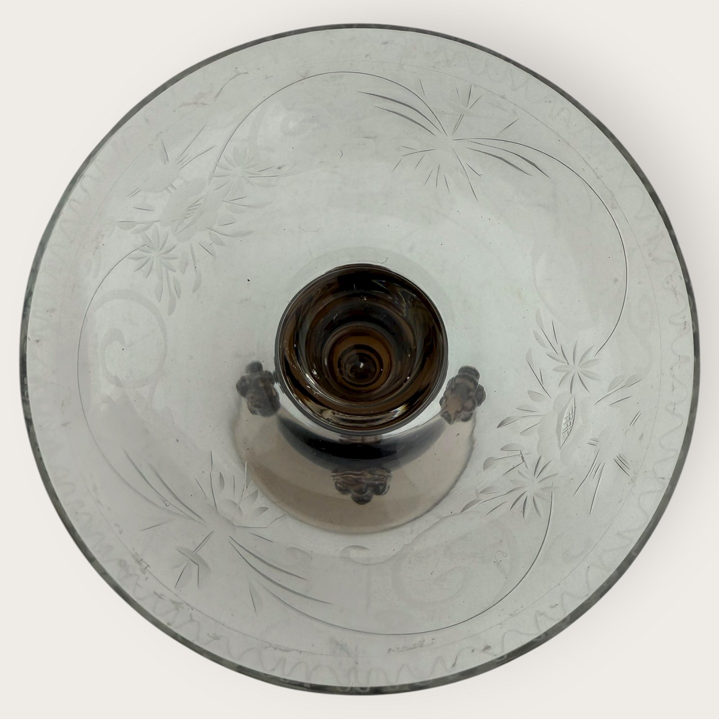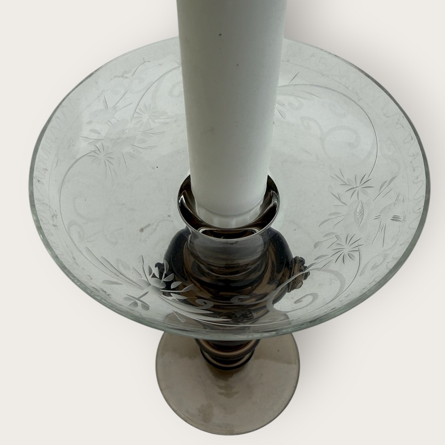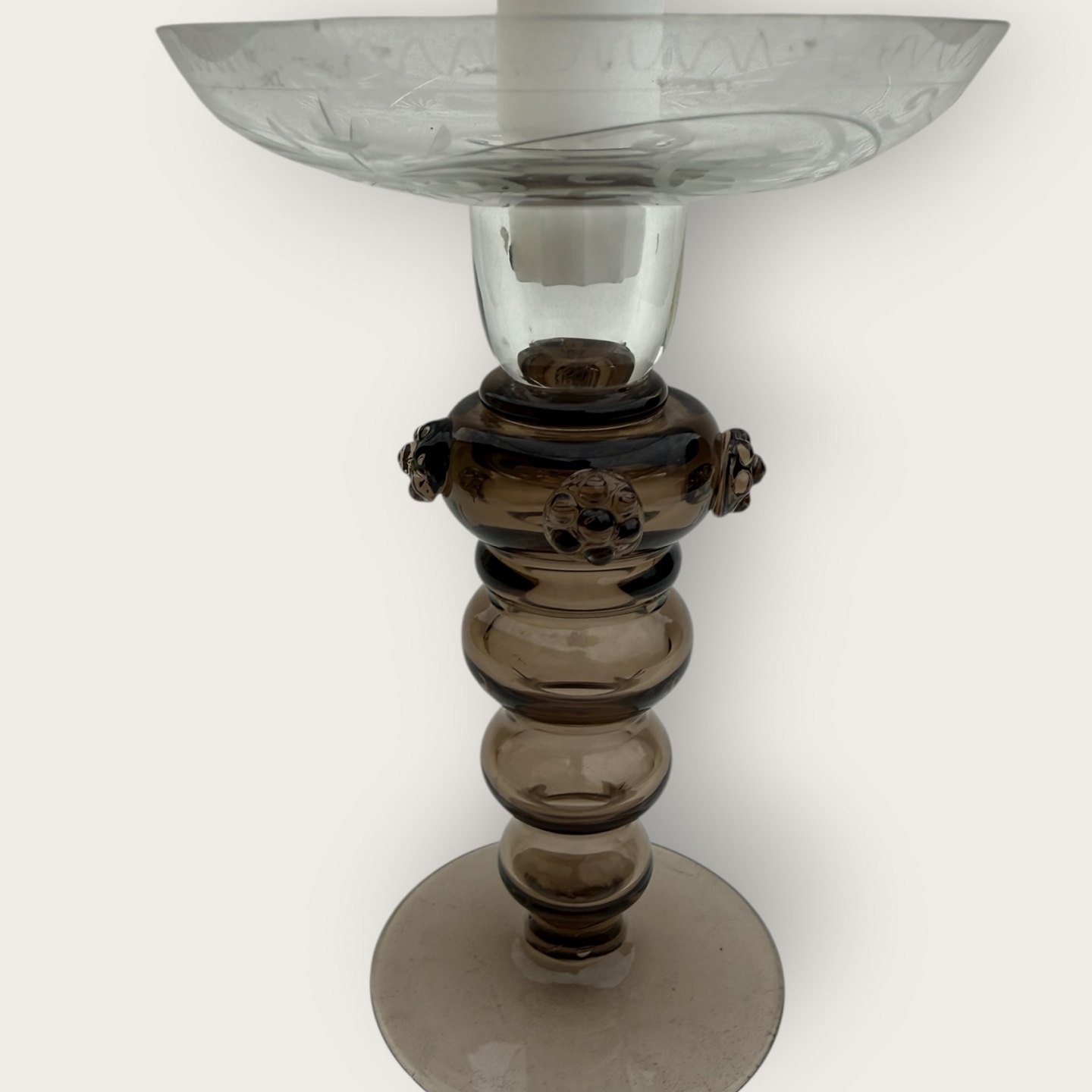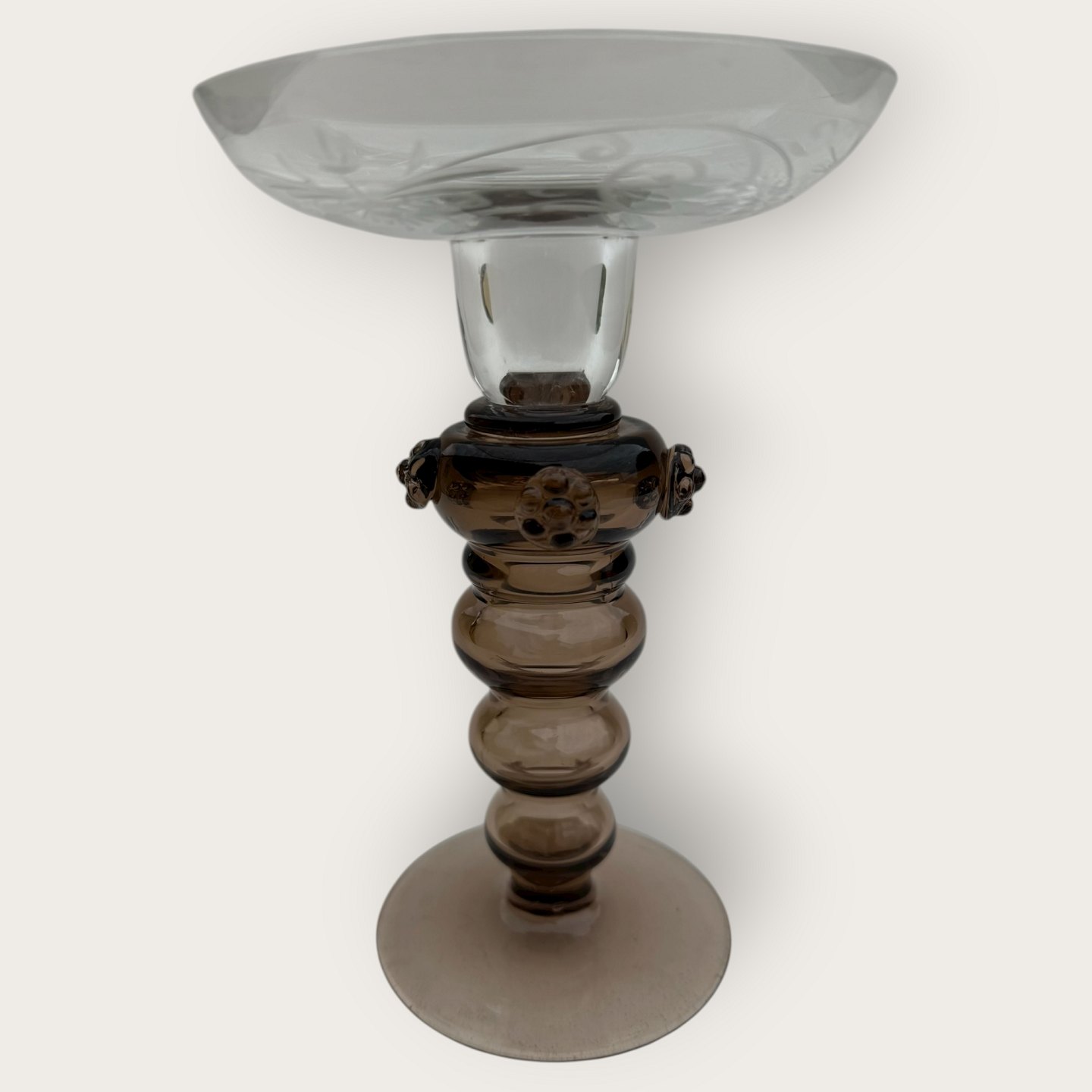 Gammel glaslysestage, hul brun stamme med rosetter, Skål med slibninger affugle, mønster og blomster, flot stand, højde 16,5cm, diameter 11cm