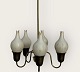 Lysekrone i messing med glasskærme, 5 store skærme i tulipan form, Sandsynligvis fremstillet hos Fog og Mørup, hver skærm er ca. 20cm høj og 10cm i diameter, selve lampen er 42cm i diameter og 67cm høj *Flot stand*