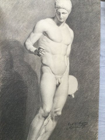 Carl V. Meyer (1870-1938): Nøgen mand - Marmorskulptur - Diskoskasteren 1893. Akademitegning. Kul på papir. Sign.: Carl V. Meyer Dateret - November 93. Uden ramme 67x38 12725