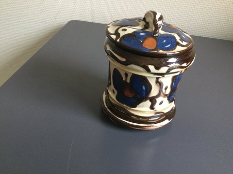 Dekoreret i blåt og brunt med kohornsteknikken.