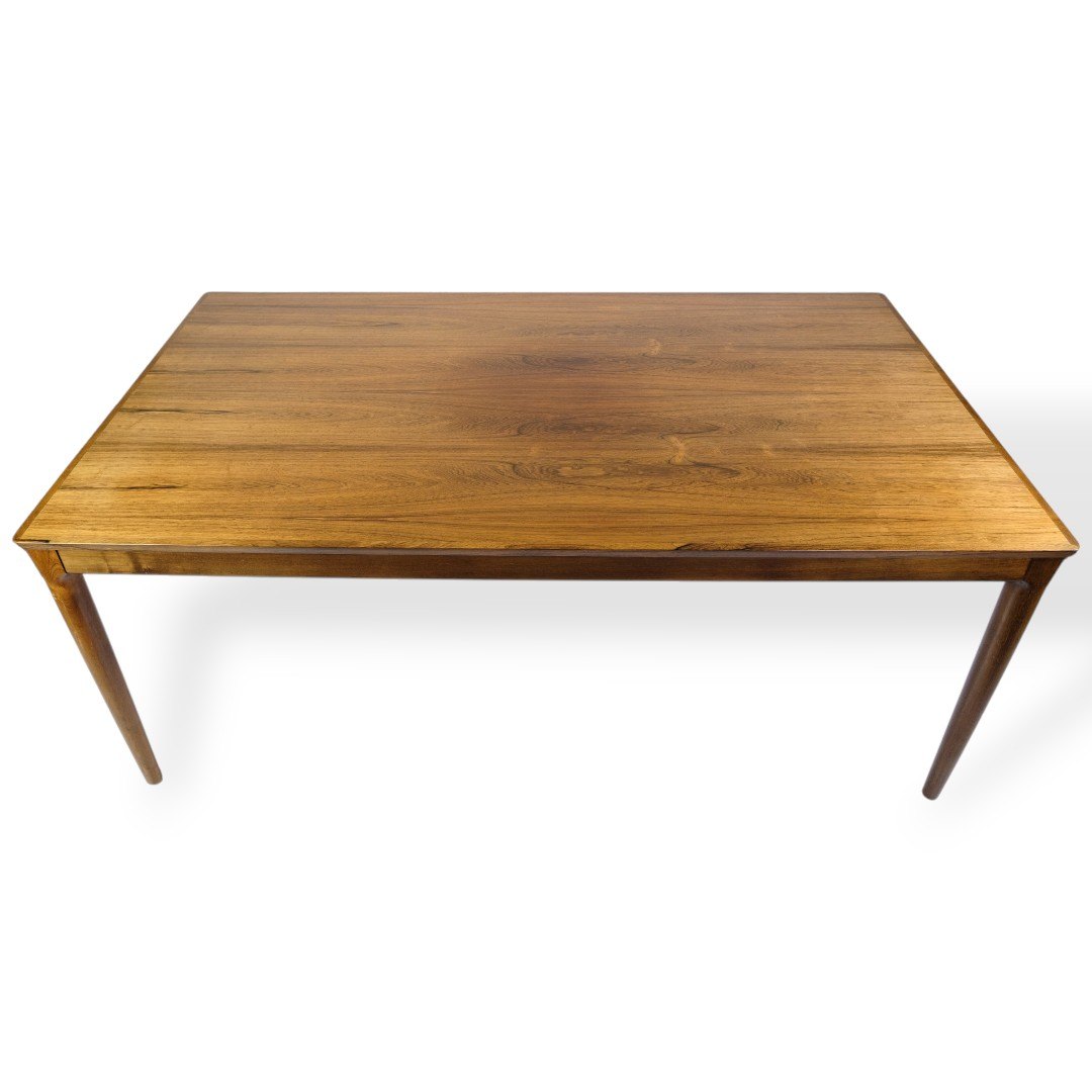 SoldExtendable dining table, made of rosewood, manufactured by Sorø Møbelfabrik in the 1960s. The table has two extension leaves, each 52.5 cm, which provides flexible expansion options. Classic Danish design with a focus on functionality, craftsmanship and beautiful materials.