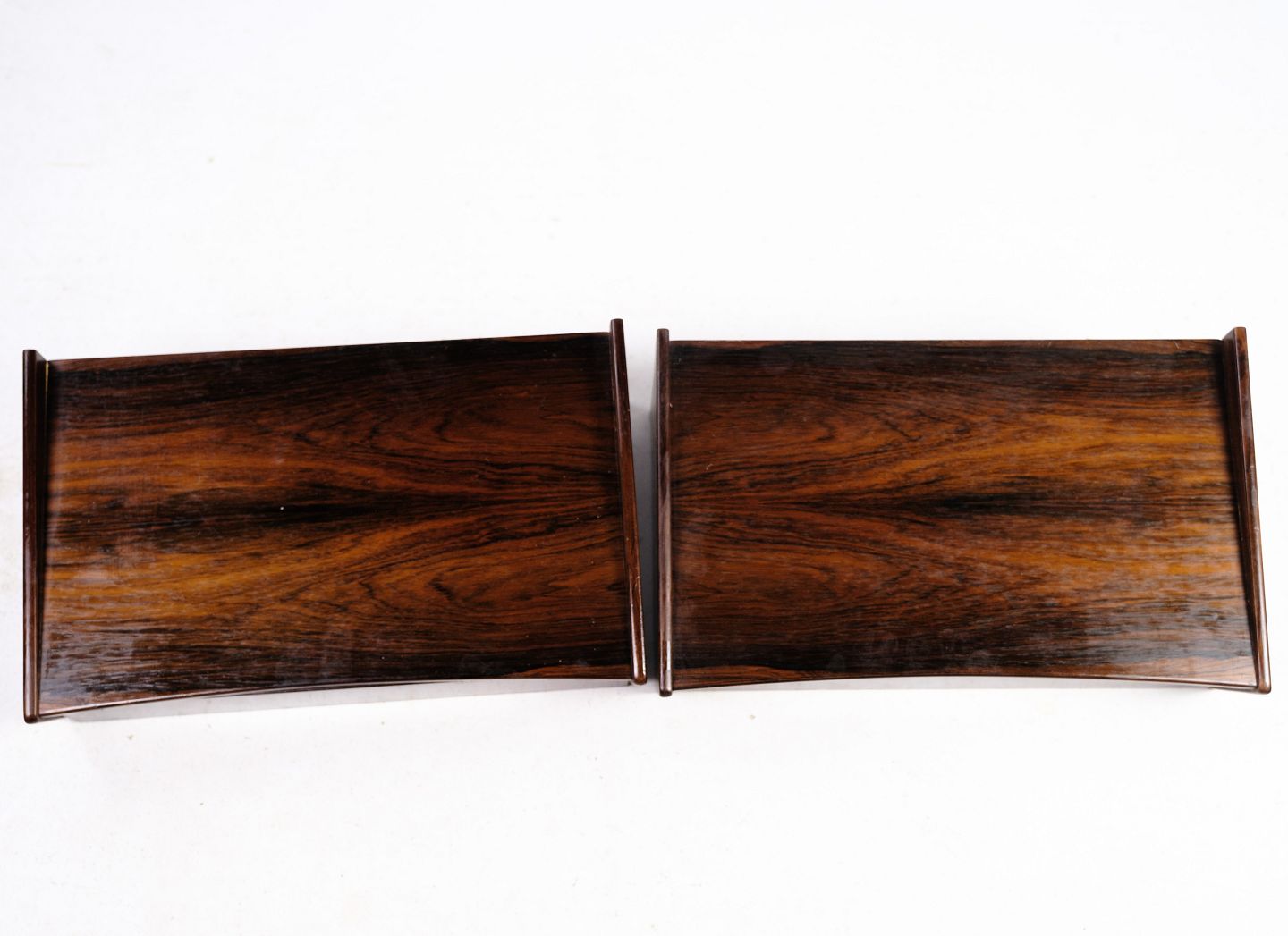 A set of wall-hung bedside tables in rosewood with drawers appears with stamps of Ølholm Møbelfabrik, Horsens from around the 1960s.