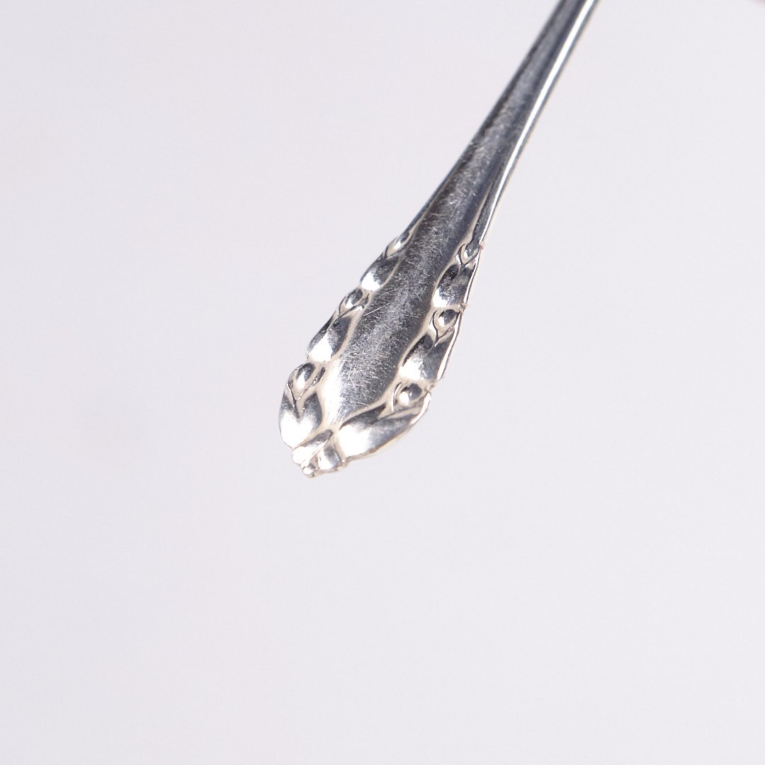Saltske i sølv fra Georg Jensen, udført i det elegante Liljekonval (Lily of the Valley) mønster. Skeen er stemplet og udformet med bløde linjer og naturlige blomsterdetaljer, der kendetegner Georg Jensens organiske designstil.