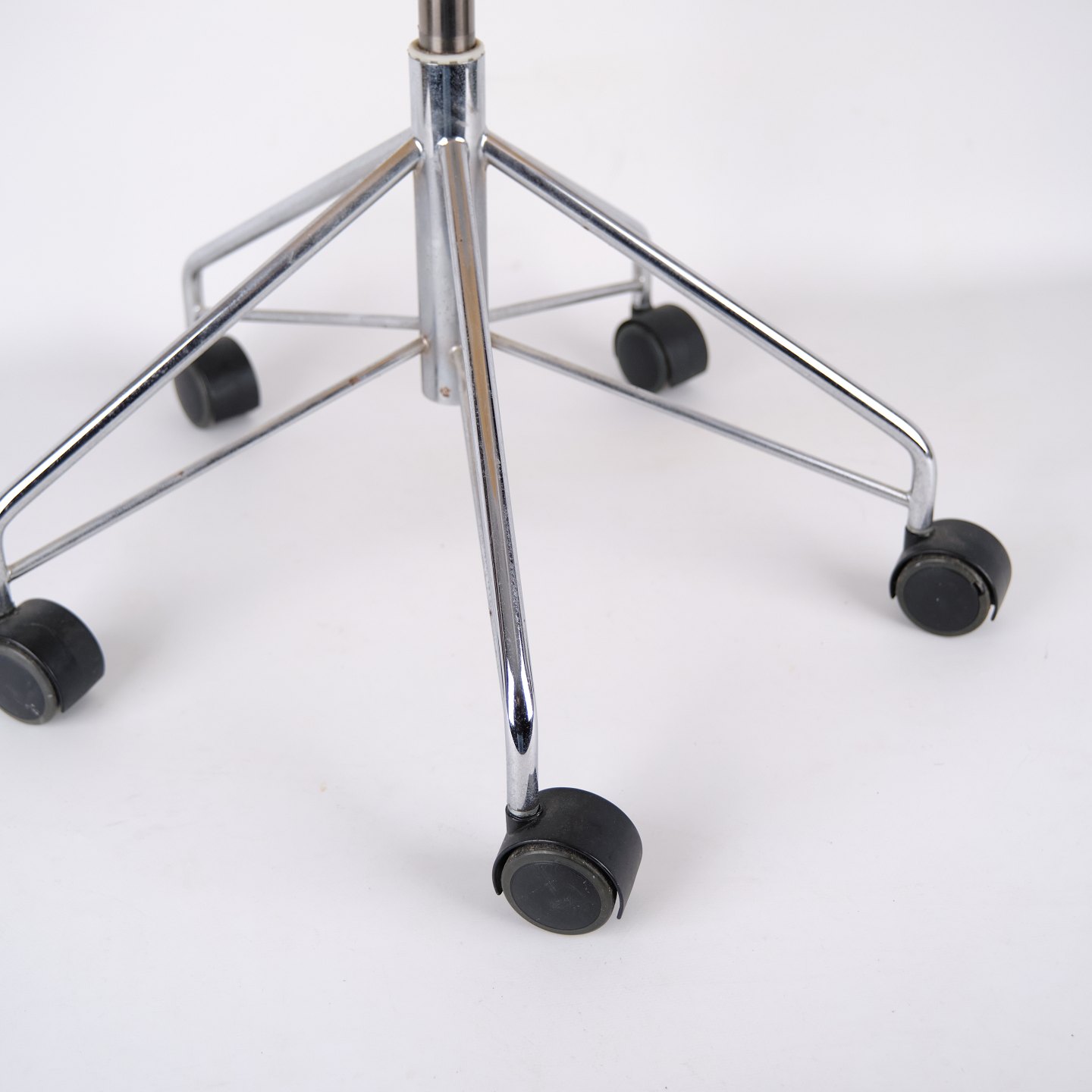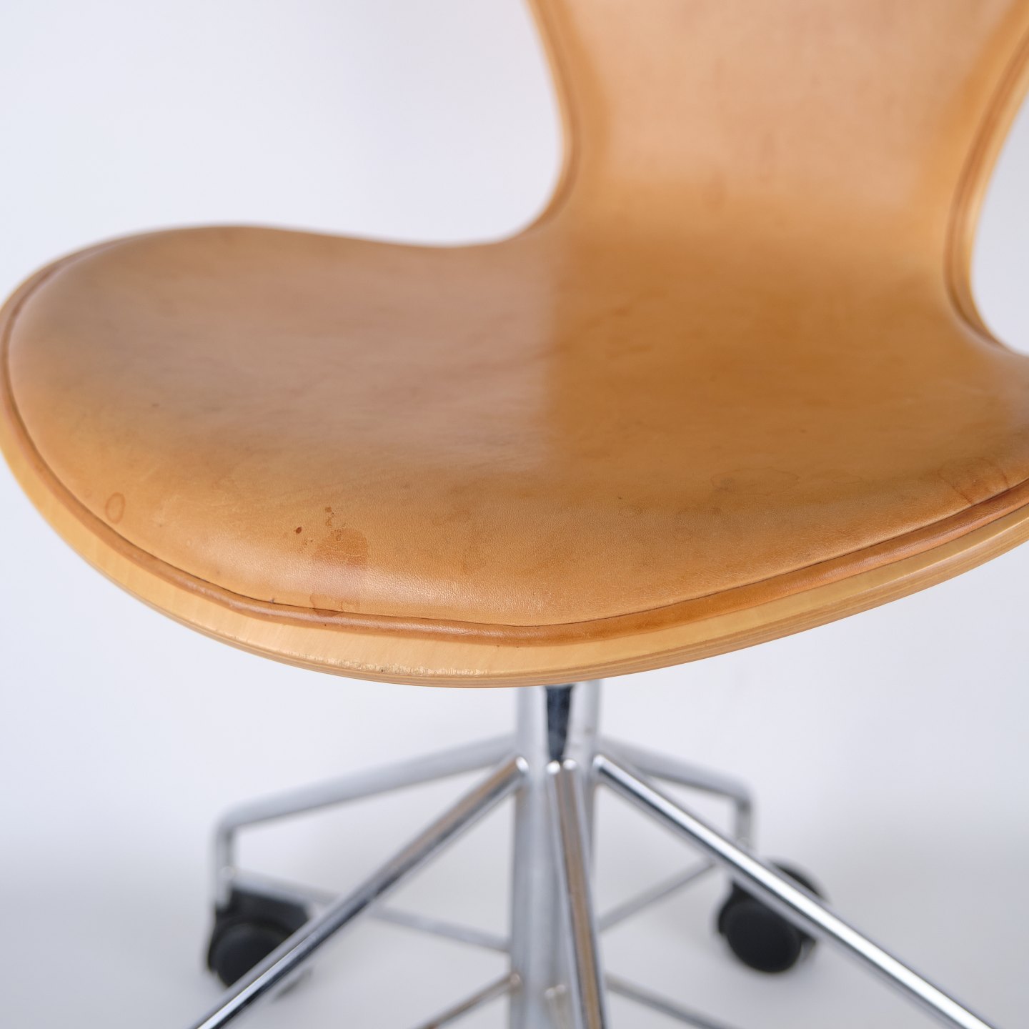 Arne Jacobsen Syver office chair, model 3117, for Fritz Hansen. Patinated natural leather and chrome frame with wheels. Classic Danish design.