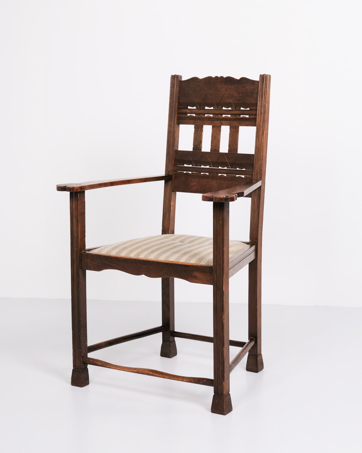 Antik armstol i egetræ fra 1930’erne med stribet polstring.