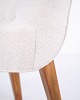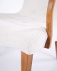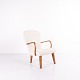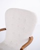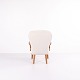Klassisk lænestol fra 1940’erne, betrukket med lyst stof og udført i et tidstypisk, afrundet formsprog. Stolen har en elegant, opret ryg og let buede armlæn. Designet af Alfred Christiansen