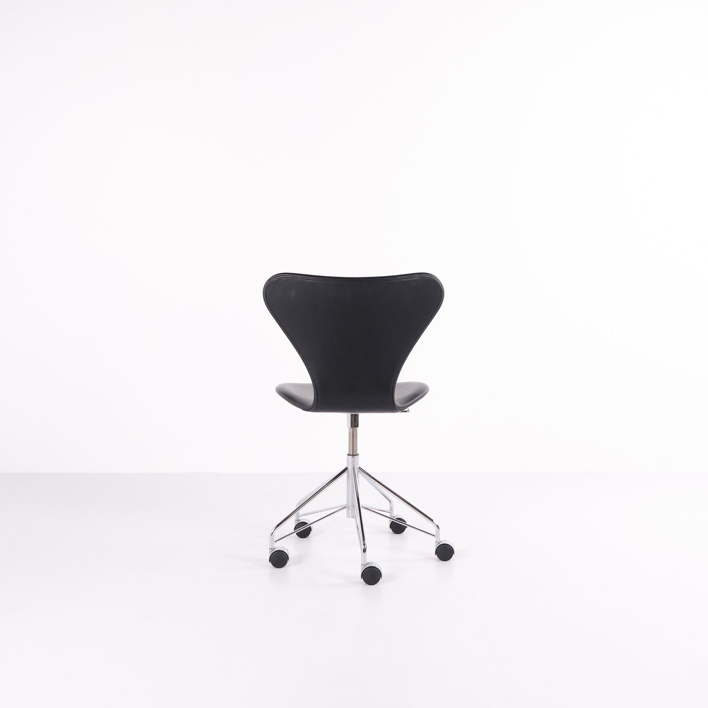Arne Jacobsen Syver kontorstol, model 3117, for Fritz Hansen. I sortlæder og kromstel med hjul. Klassisk dansk design.