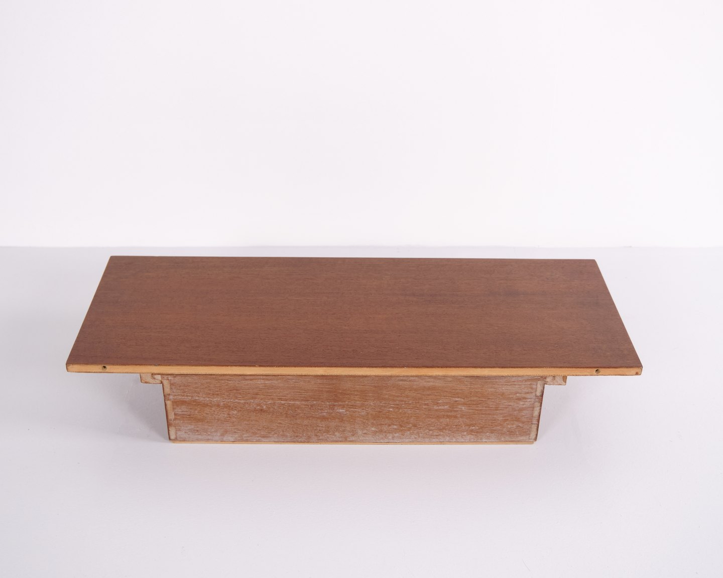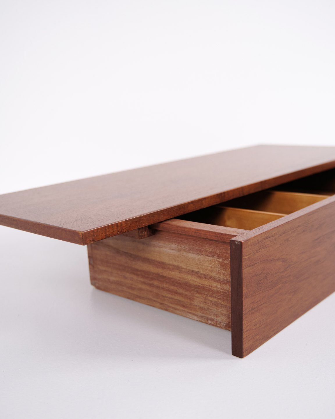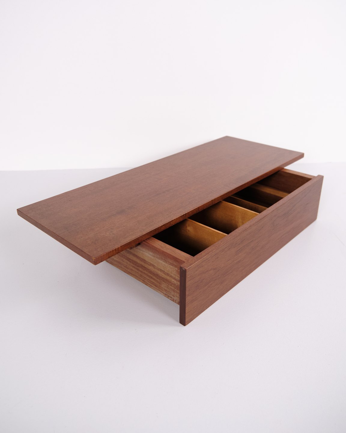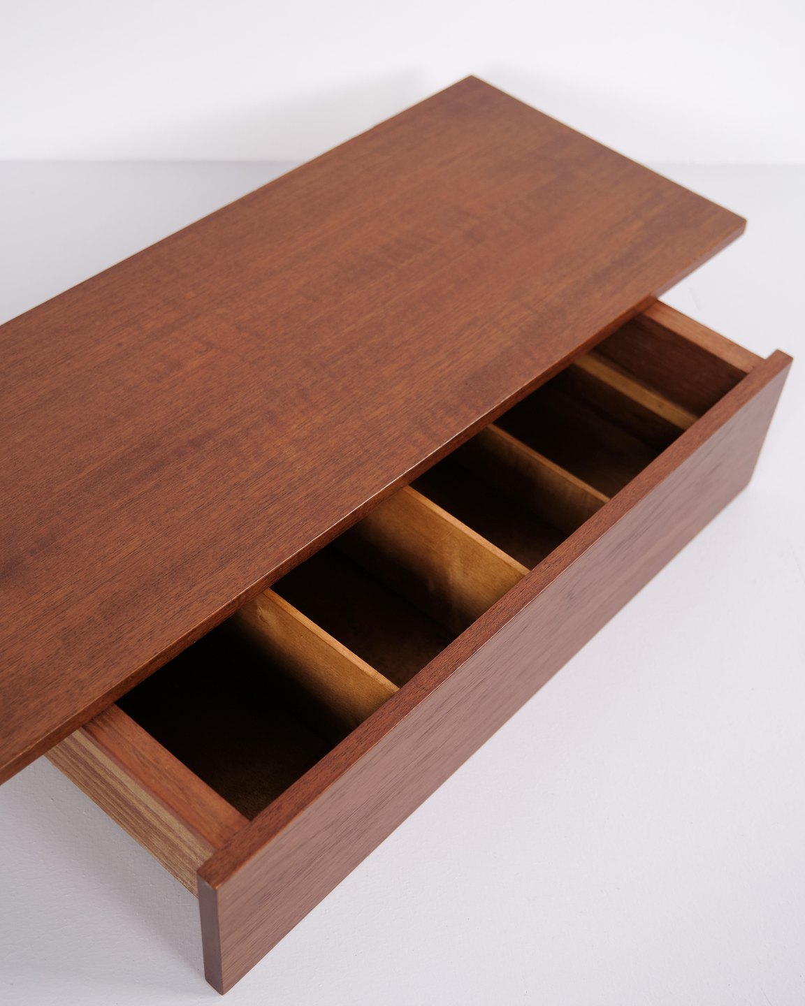 Væghængt hylde fra 1960’erne, udført i teaktræ med en rummelig skuffe integreret i fronten.