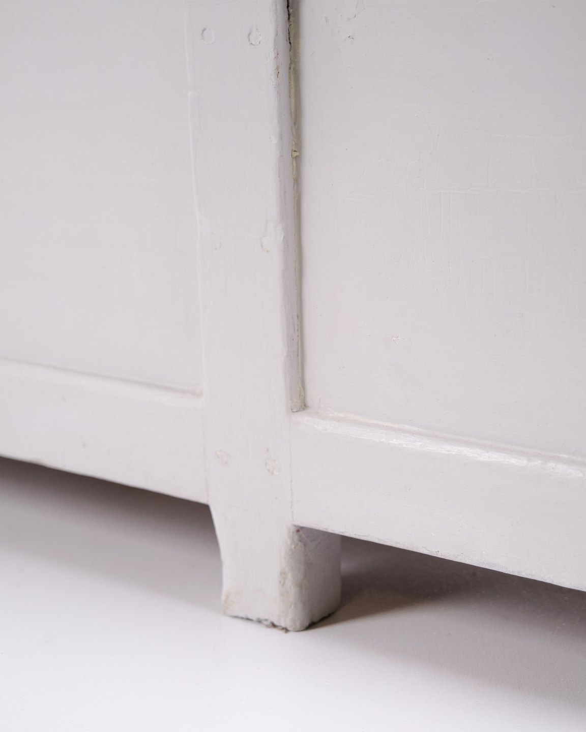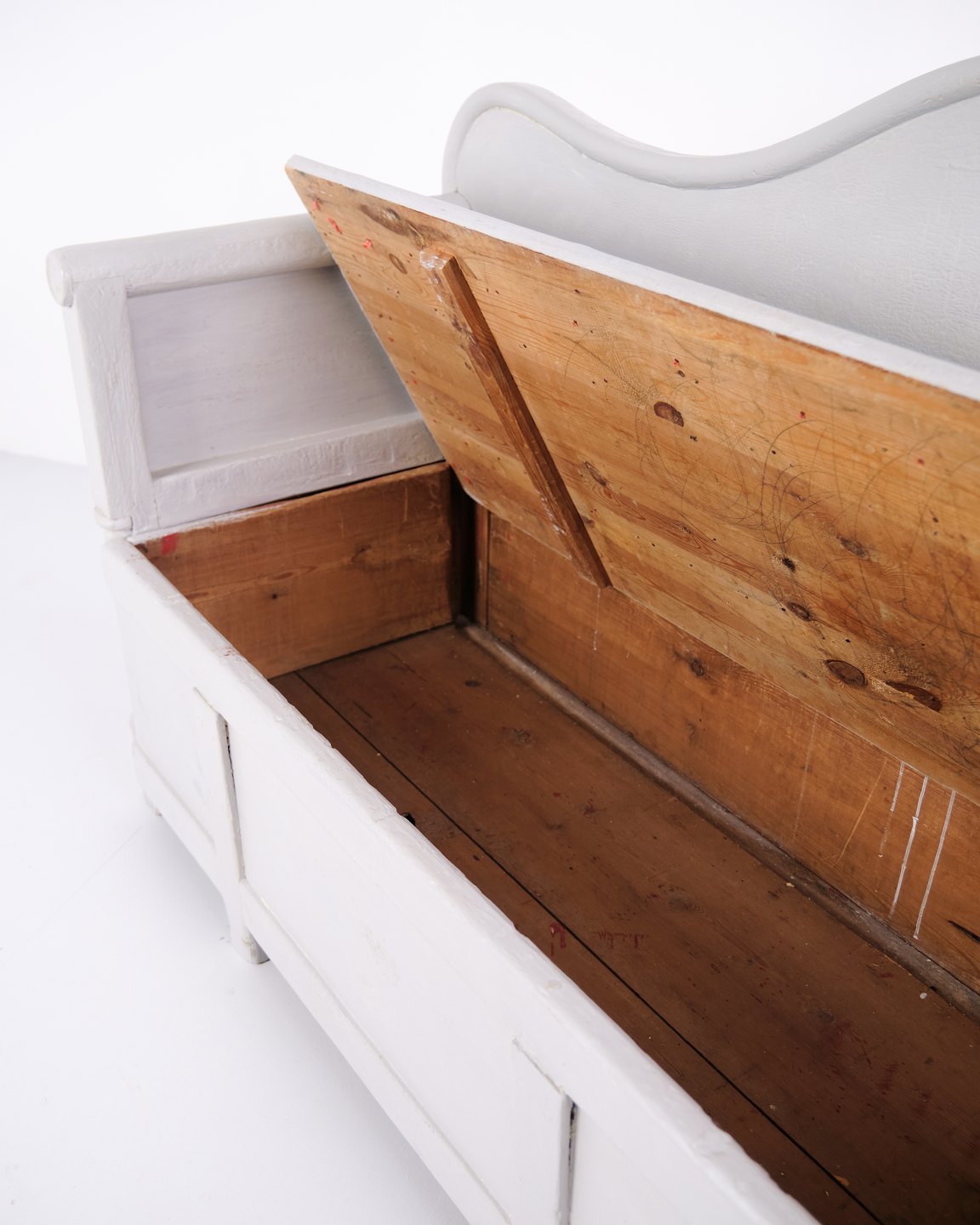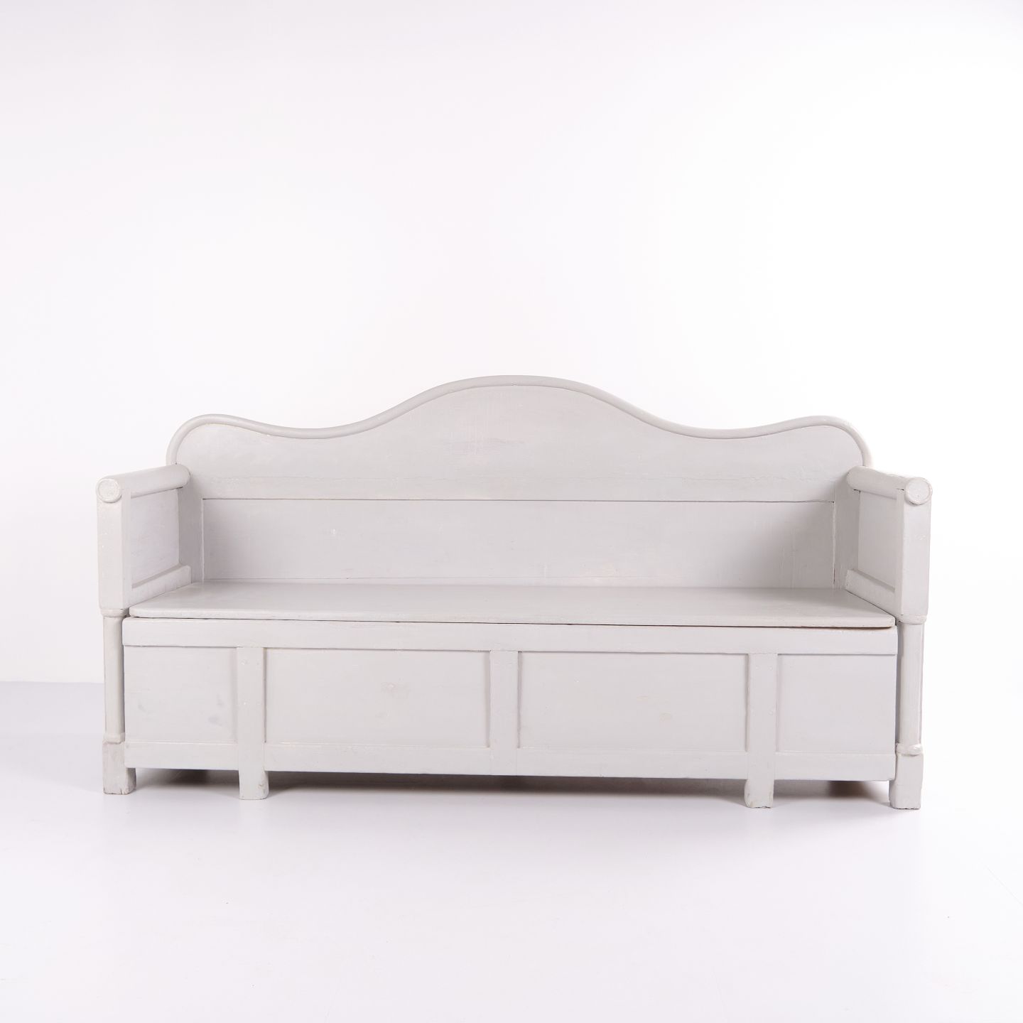Antik svensk slagbænk fra 1900-tallet, udført i fyrretræ og grå bemalet. Klassisk model med opbevaringsrum under sædet og tidstypiske skandinaviske detaljer. Solidt møbel, velegnet til entré, køkken eller stue.