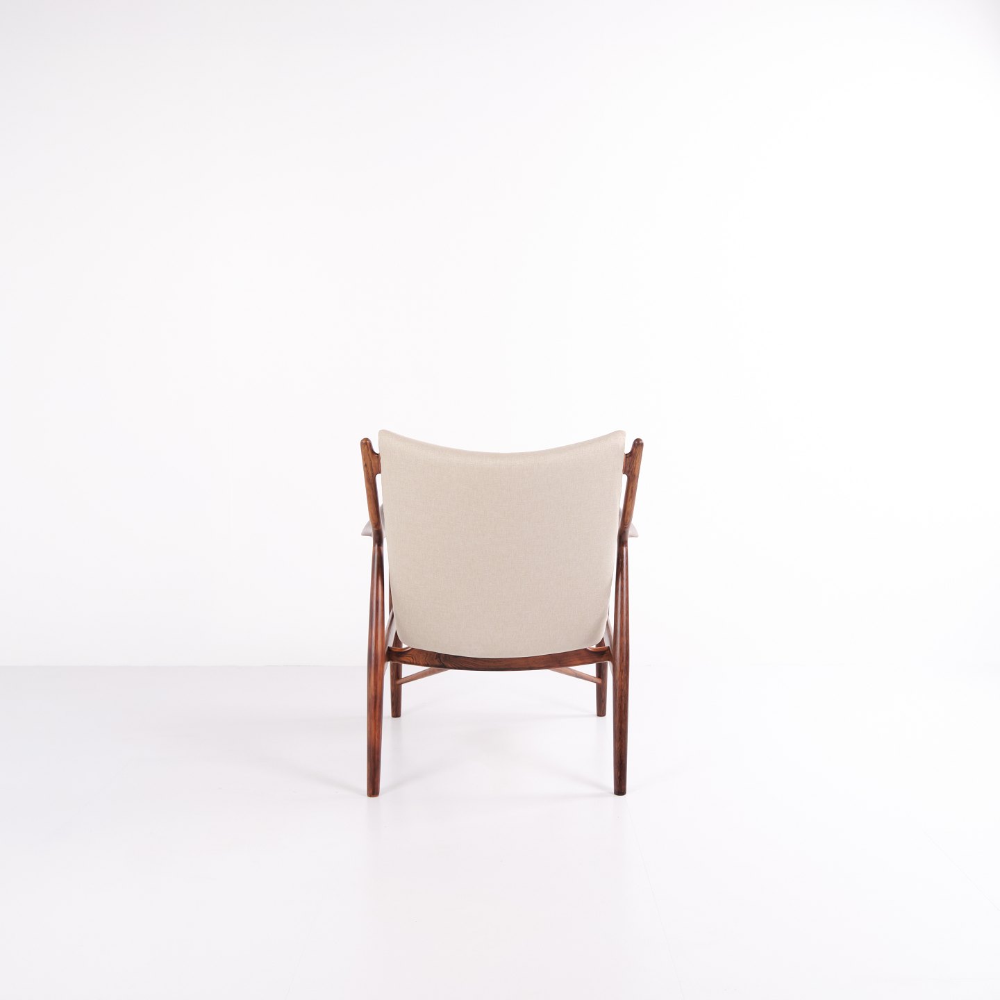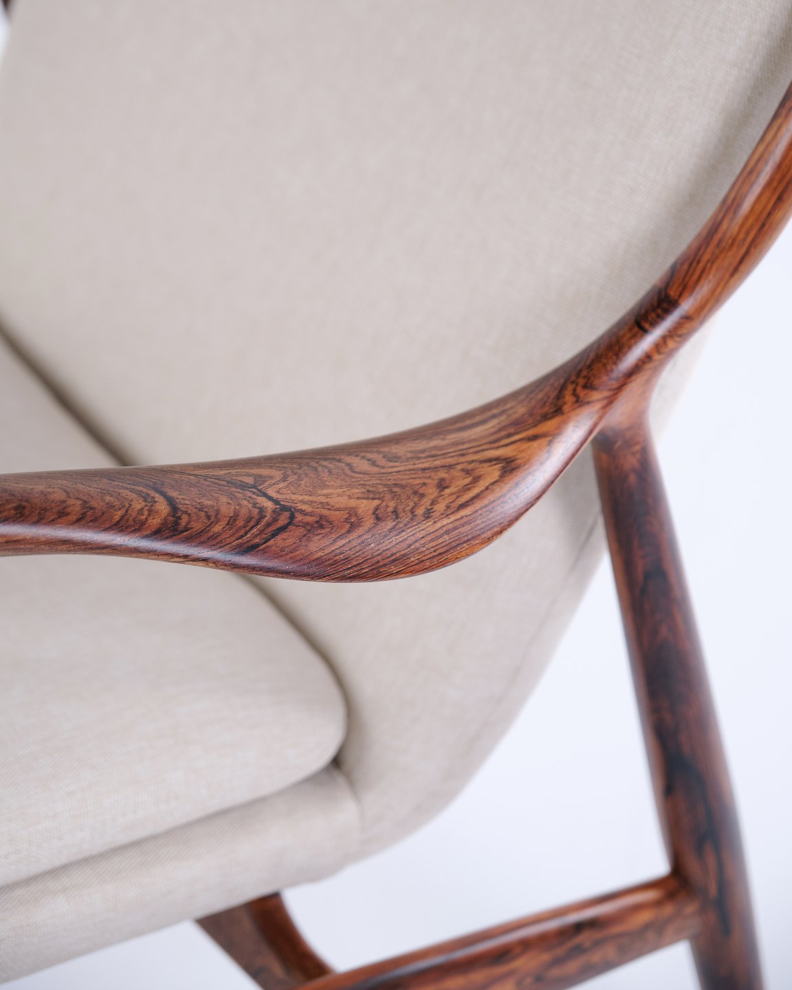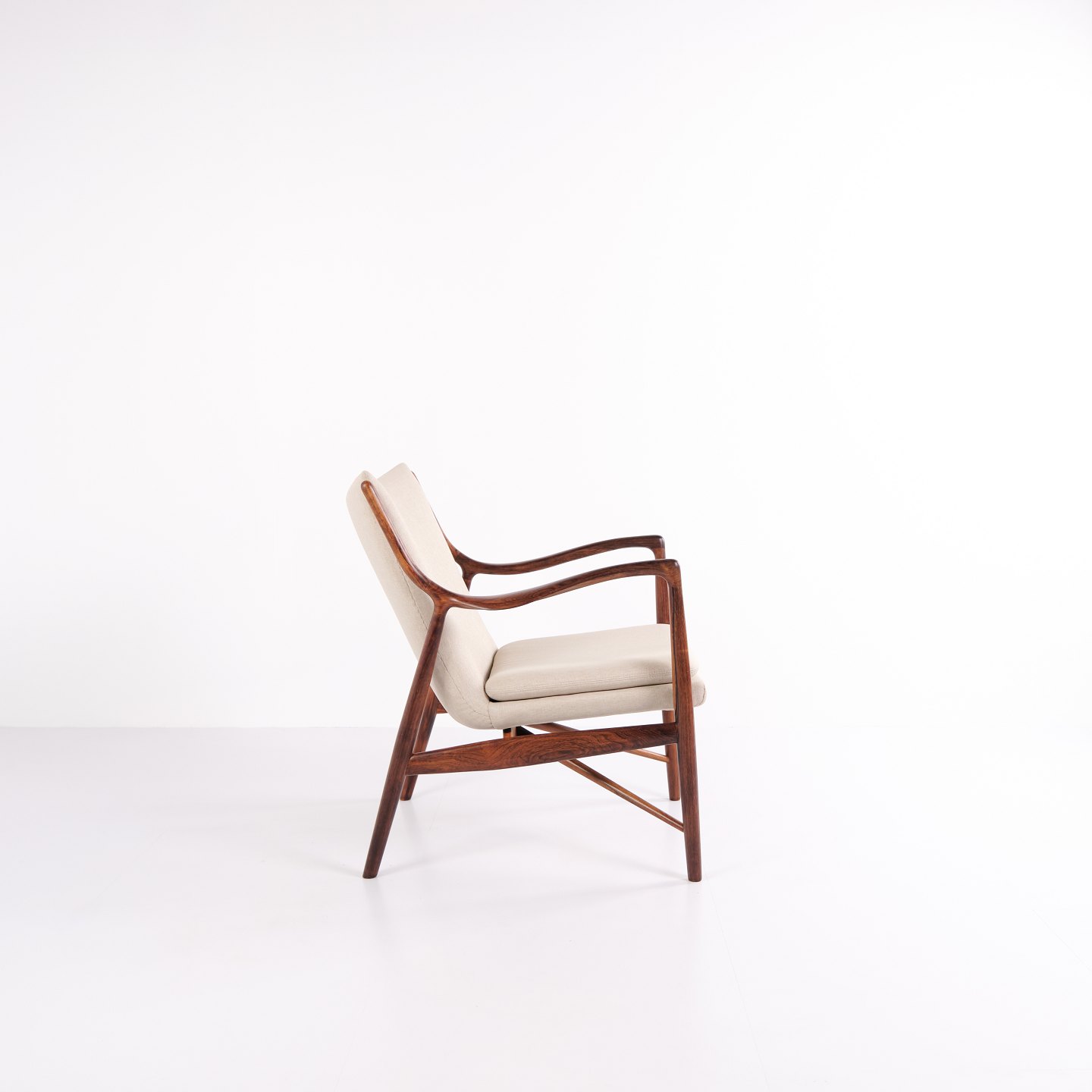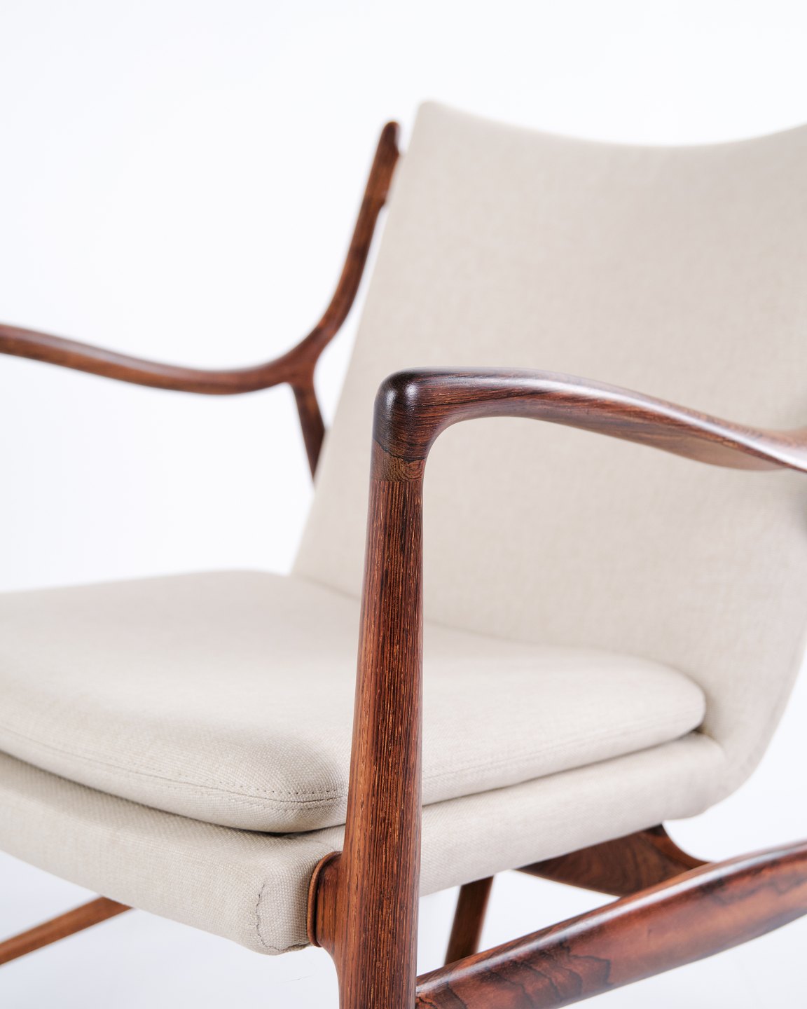 Ikonisk lænestol, model NV45, designet af Finn Juhl og udført af snedkermester Niels Vodder i 1950’erne. Stolen er fremstillet i palisander med fritbærende sæde og ryg betrukket med lyst stof, hvilket fremhæver Finn Juhls karakteristiske skulpturelle formsprog og lette konstruktion.