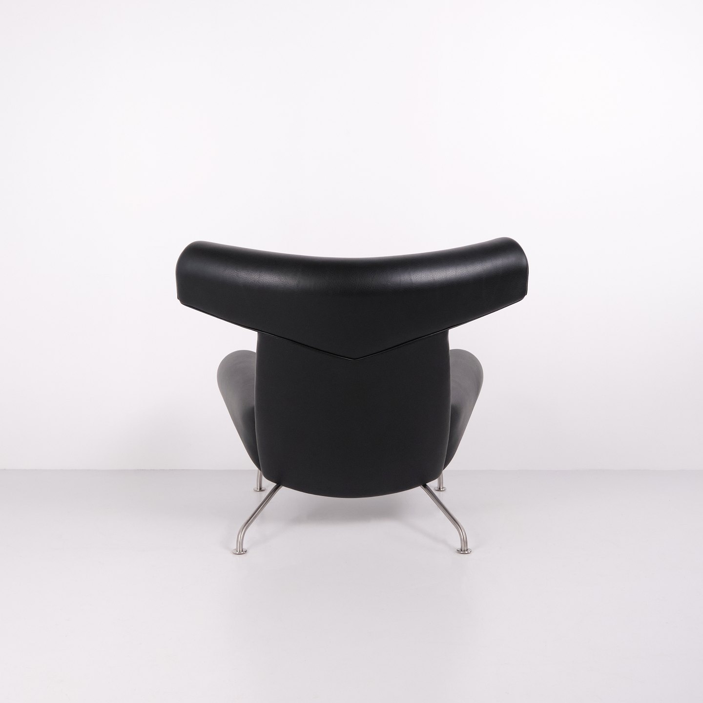 Ox Chair model EJ100 med tilhørende skammel designet af Hans J. Wegner. Modellen blev tegnet i 1960 og produceres i dag af Fredericia Furniture efter overtagelsen af Erik Jørgensen. Stolen er udført i sort læder med stel i stål. Det markante ryglæn med “horn” gav modellen navnet Ox Chair. ´