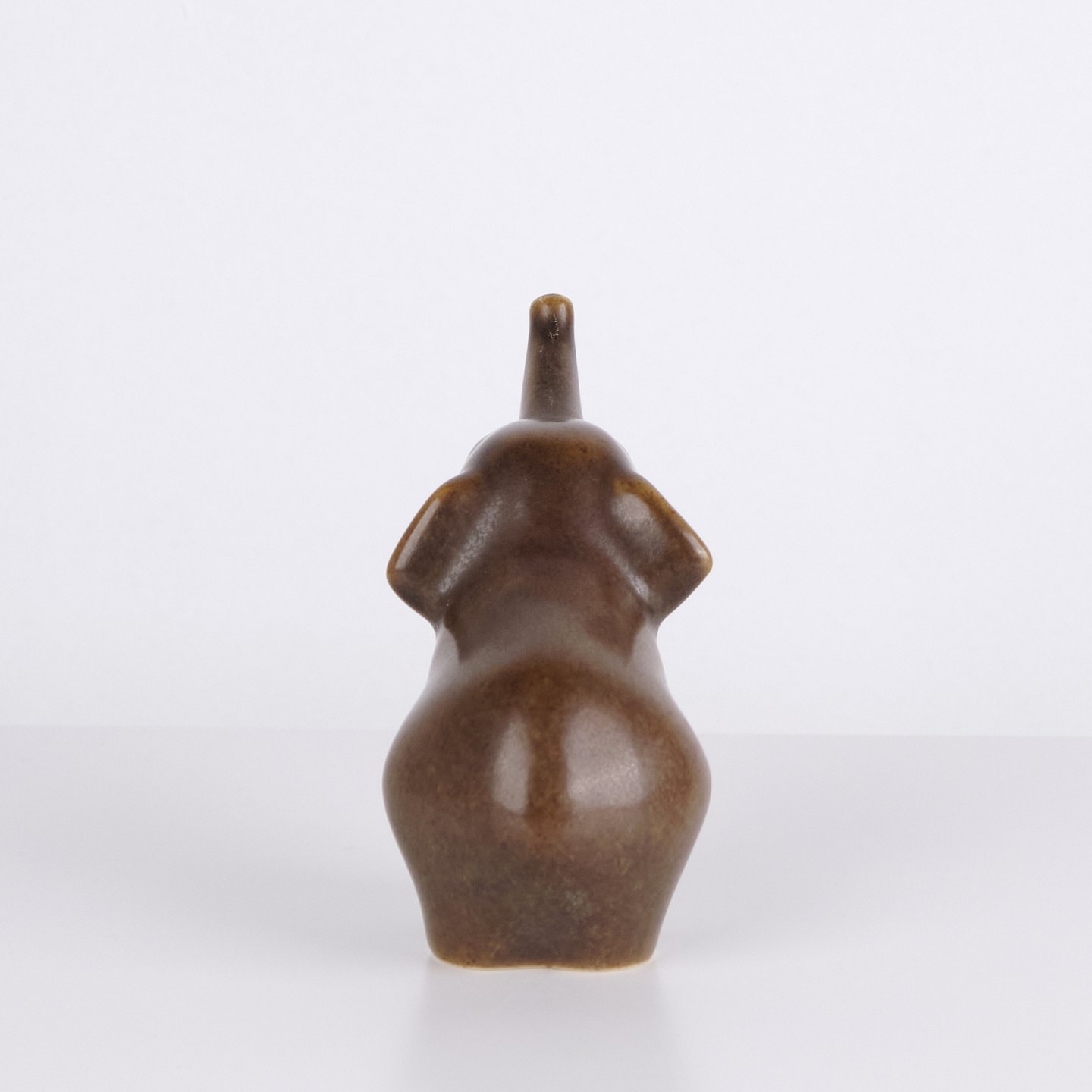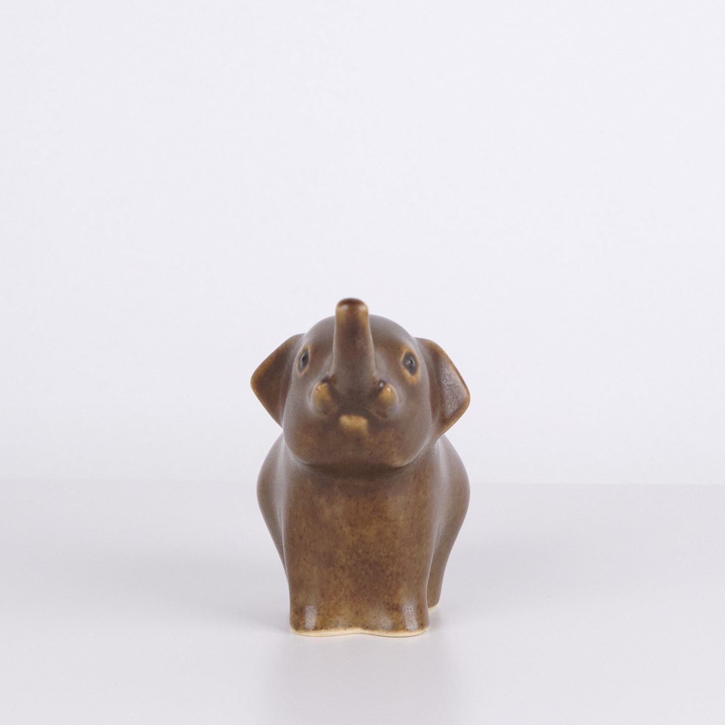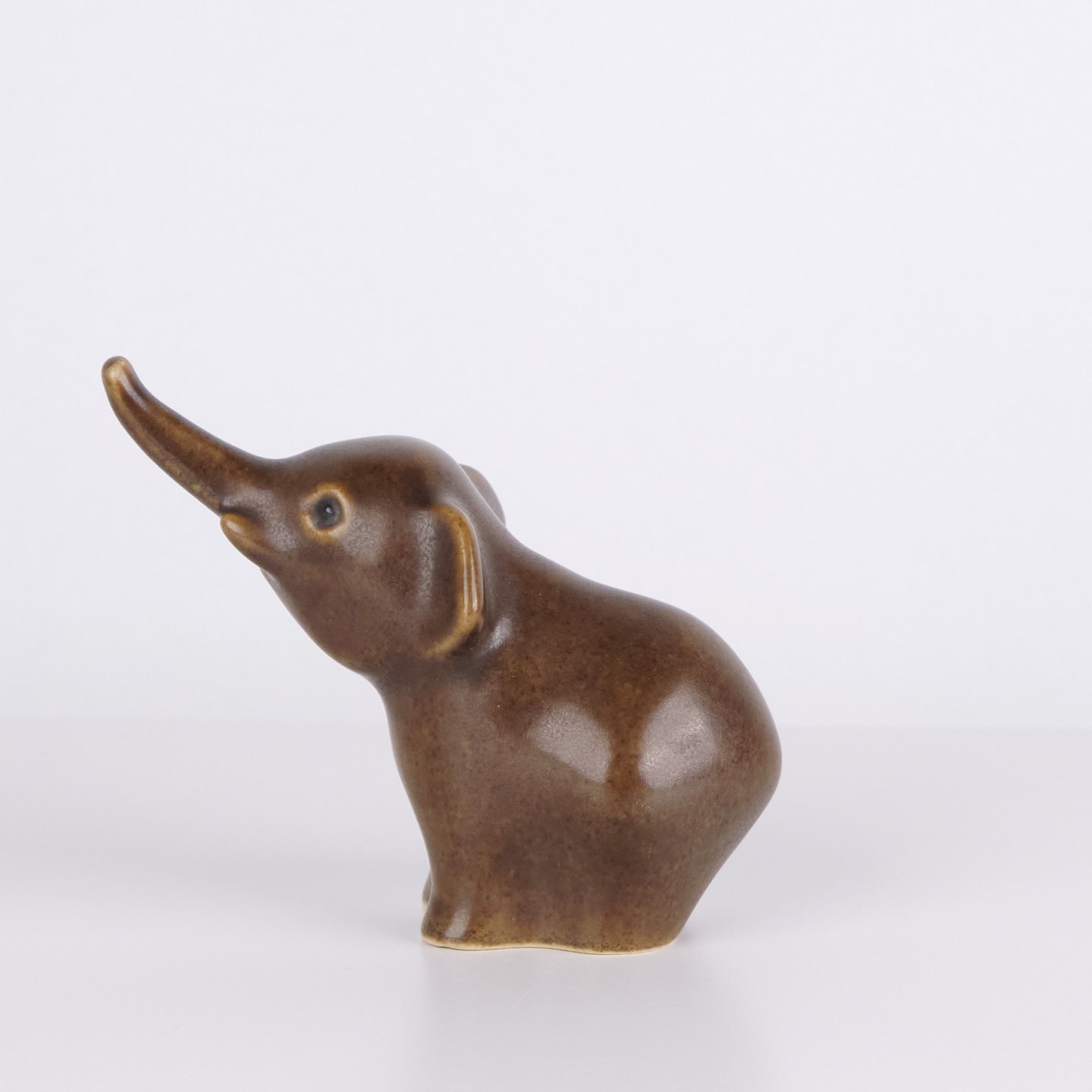 Elefantfigur af Knud Basse udført i brun glaseret keramik. Figuren er modelleret med løftet snabel og afrundede former, som giver et levende og dekorativt udtryk. Et klassisk eksempel på dansk dyrekeramik, hvor enkle linjer og karakterfulde motiver er i fokus. Eftertragtet figur blandt samlere af Knud Basse og dansk keramik.