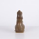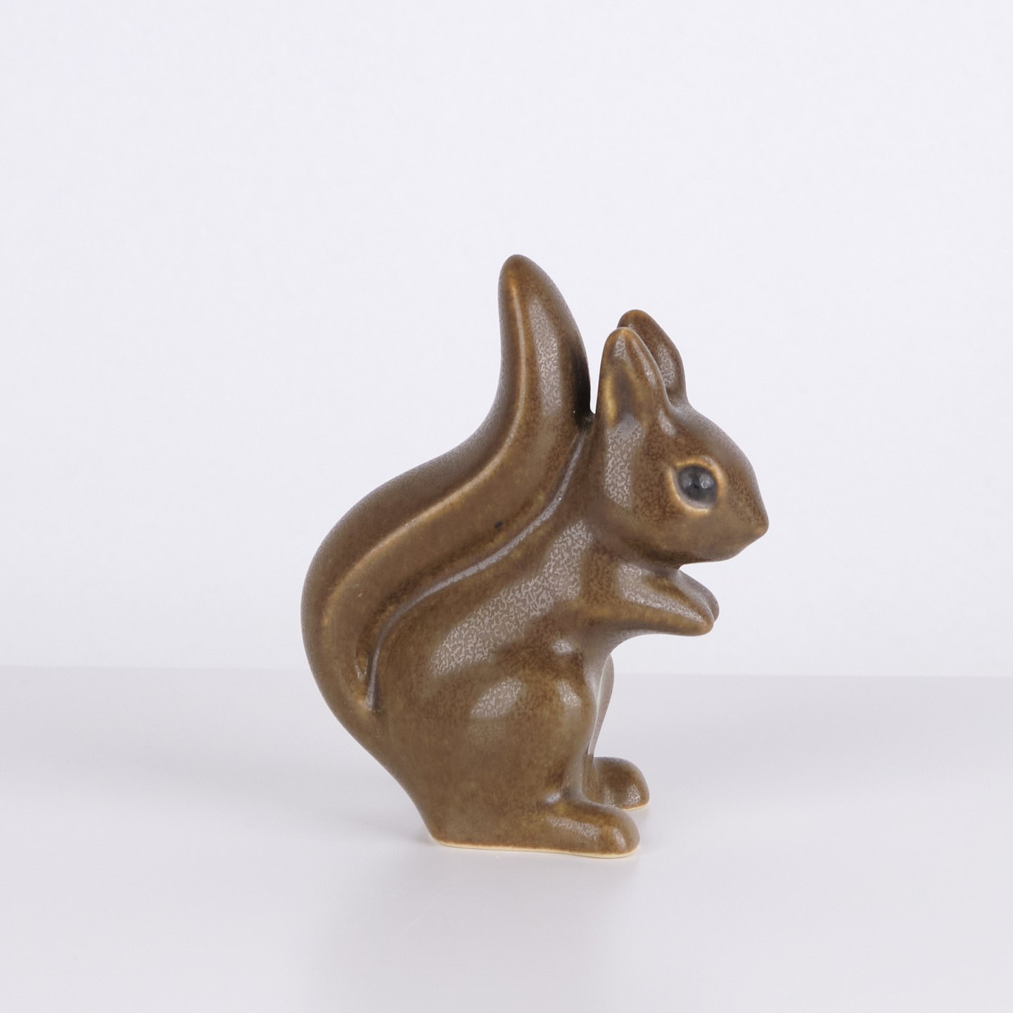 Harefigur af Knud Basse udført i brun glaseret keramik. Modellen viser opret siddende hare med samlet forpoter og markant haleform bagtil. Figuren er dekoreret med lys detalje på fronten og er et klassisk eksempel på Knud Basses populære dyrefigurer fra 1960’erne.