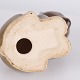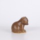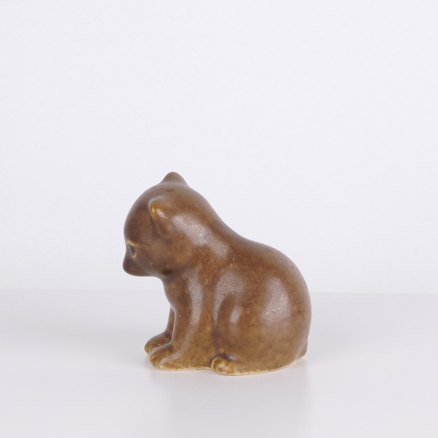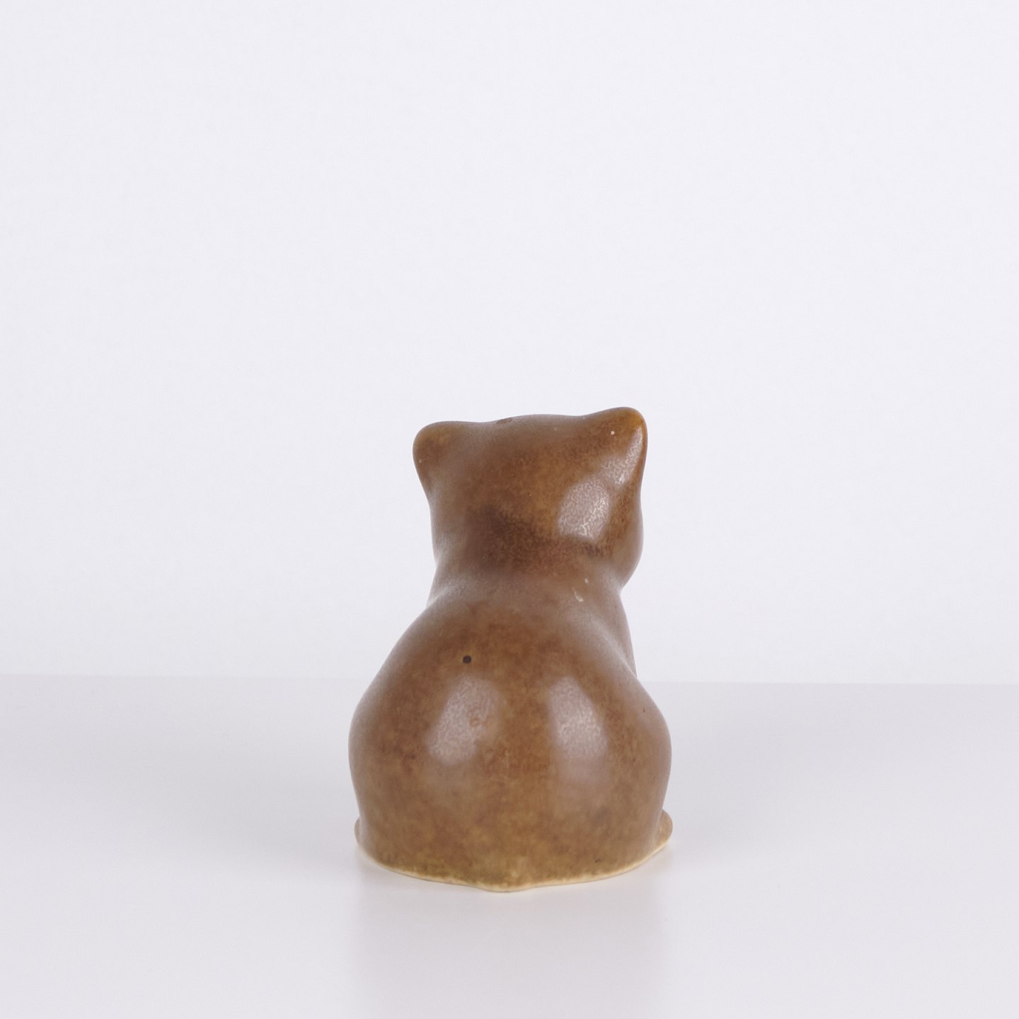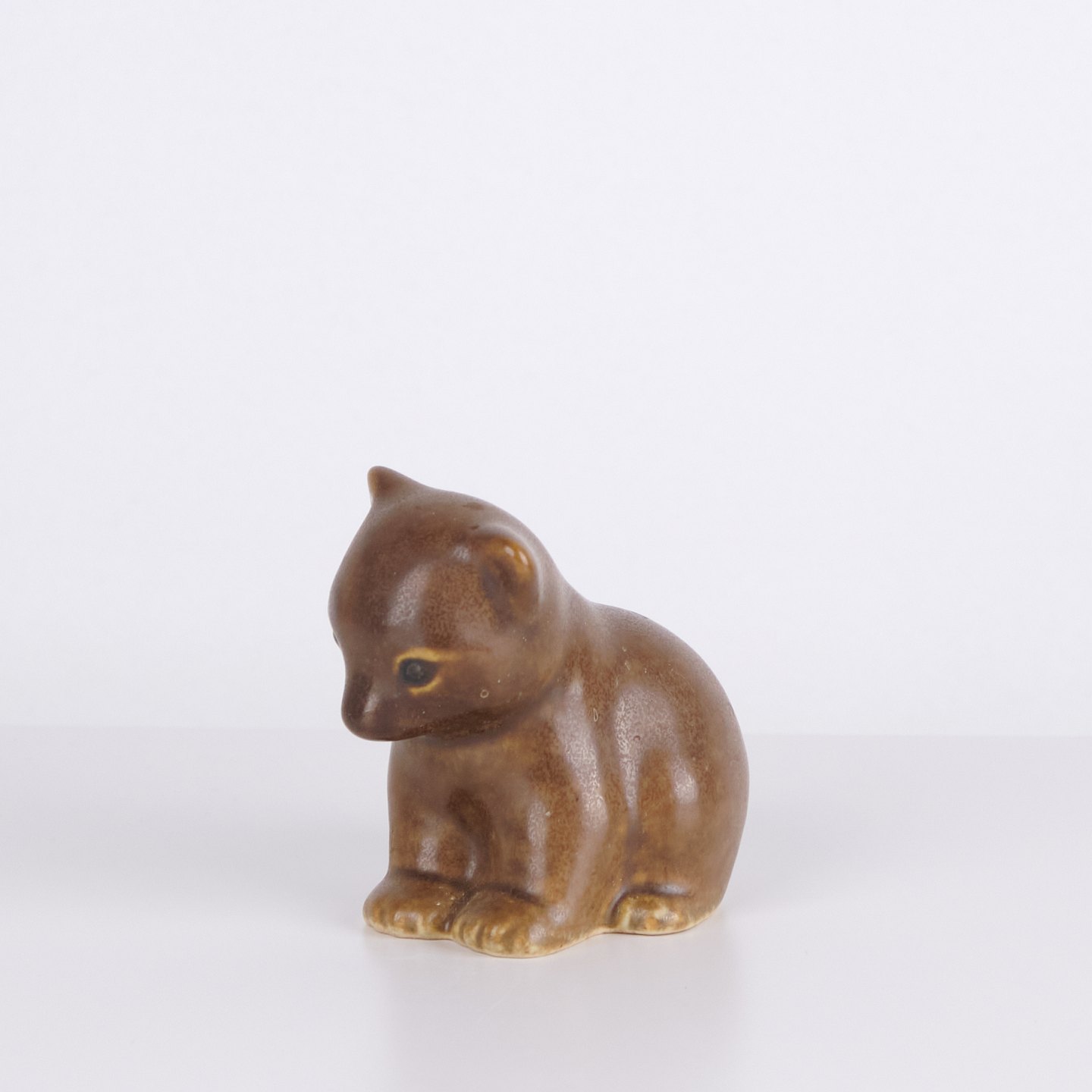 Bjørnefigur af Knud Basse udført i brun glaseret keramik. Figuren viser siddende bjørn med sænket hoved, markerede poter og bløde former. En mindre model fra Knud Basses serie af dyrefigurer, produceret i Danmark i 1960’erne.