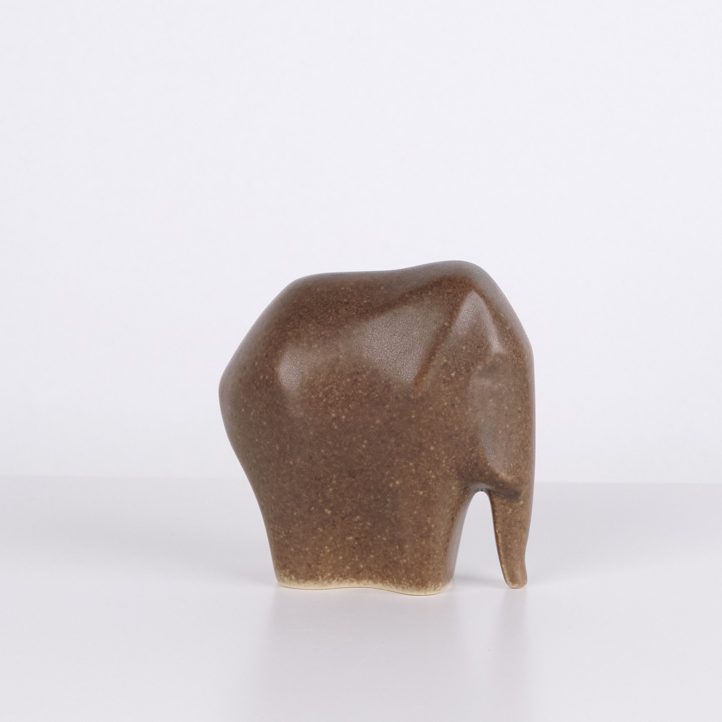 Elefantfigur af Knud Basse udført i brun glaseret keramik. Figuren er modelleret i enkel kompakt form med nedadbøjet snabel og afrundede sider. Minimalistisk model fra Knud Basses serie af dyrefigurer, produceret i Danmark i 1960’erne.