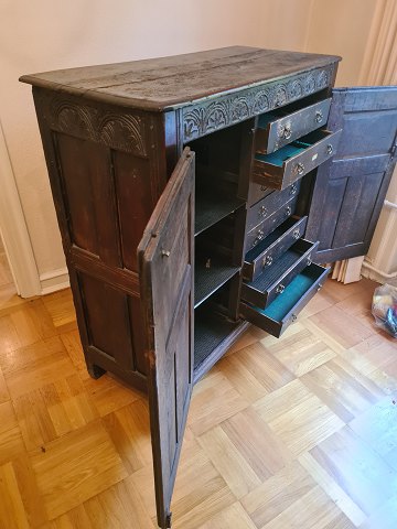 Antikt dækketøjsskab fra starten af 1800 tallet i eg. Fremstår godt og solidt med aldersrelaterede brugsspor på toppen.(billede) Umiddelbart uden nøgle.