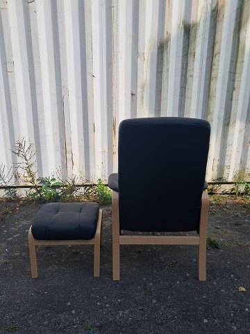 Lænestol og skammel i bøgetræ med læderbetræk, fra 2000erne.